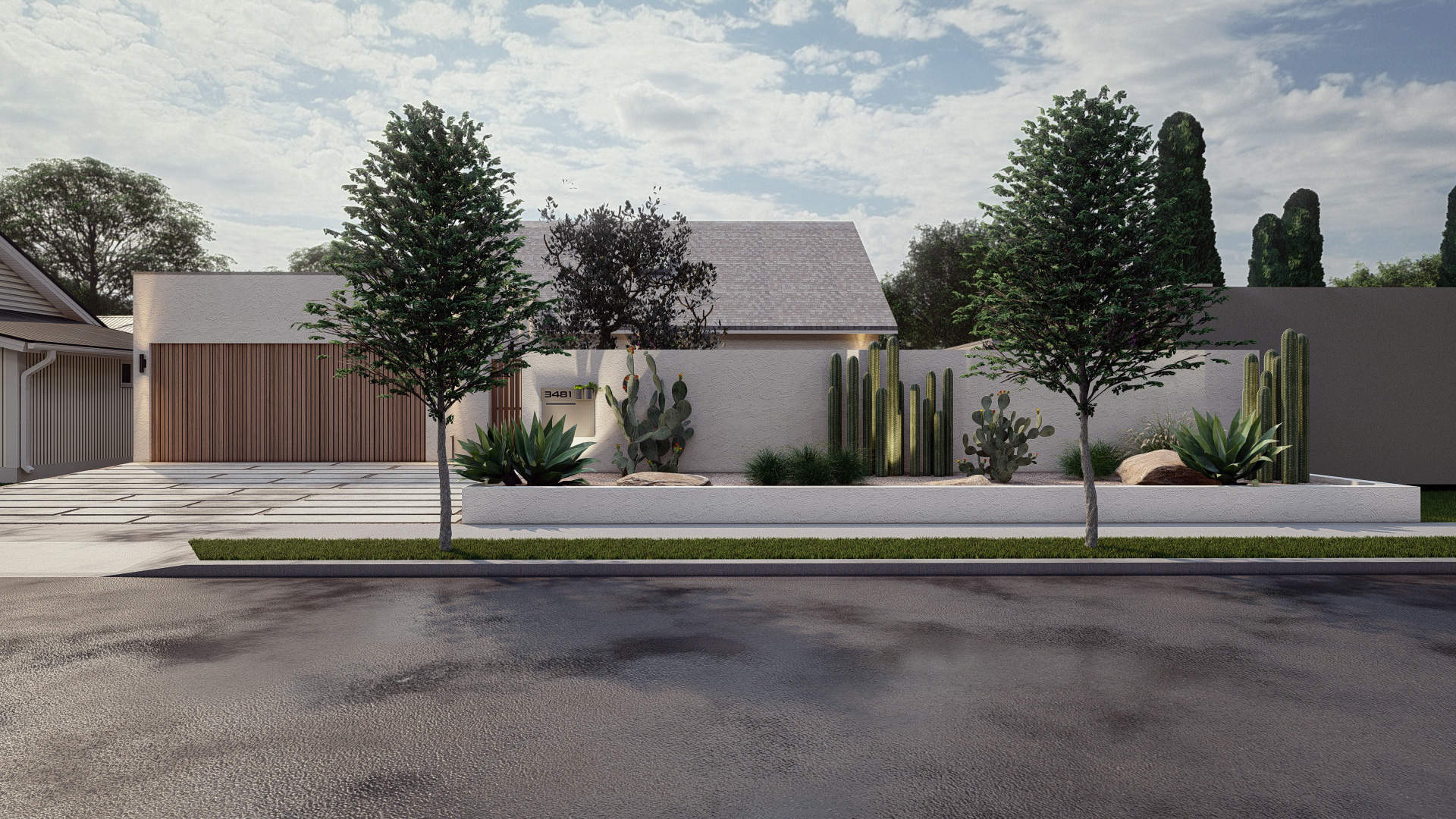 - Front Yard Xeriscape: A dramatic, drought-tolerant entry featuring architectural cacti and succulents set in a raised white planter, perfectly complementing the modern home facade and minimizing water use.