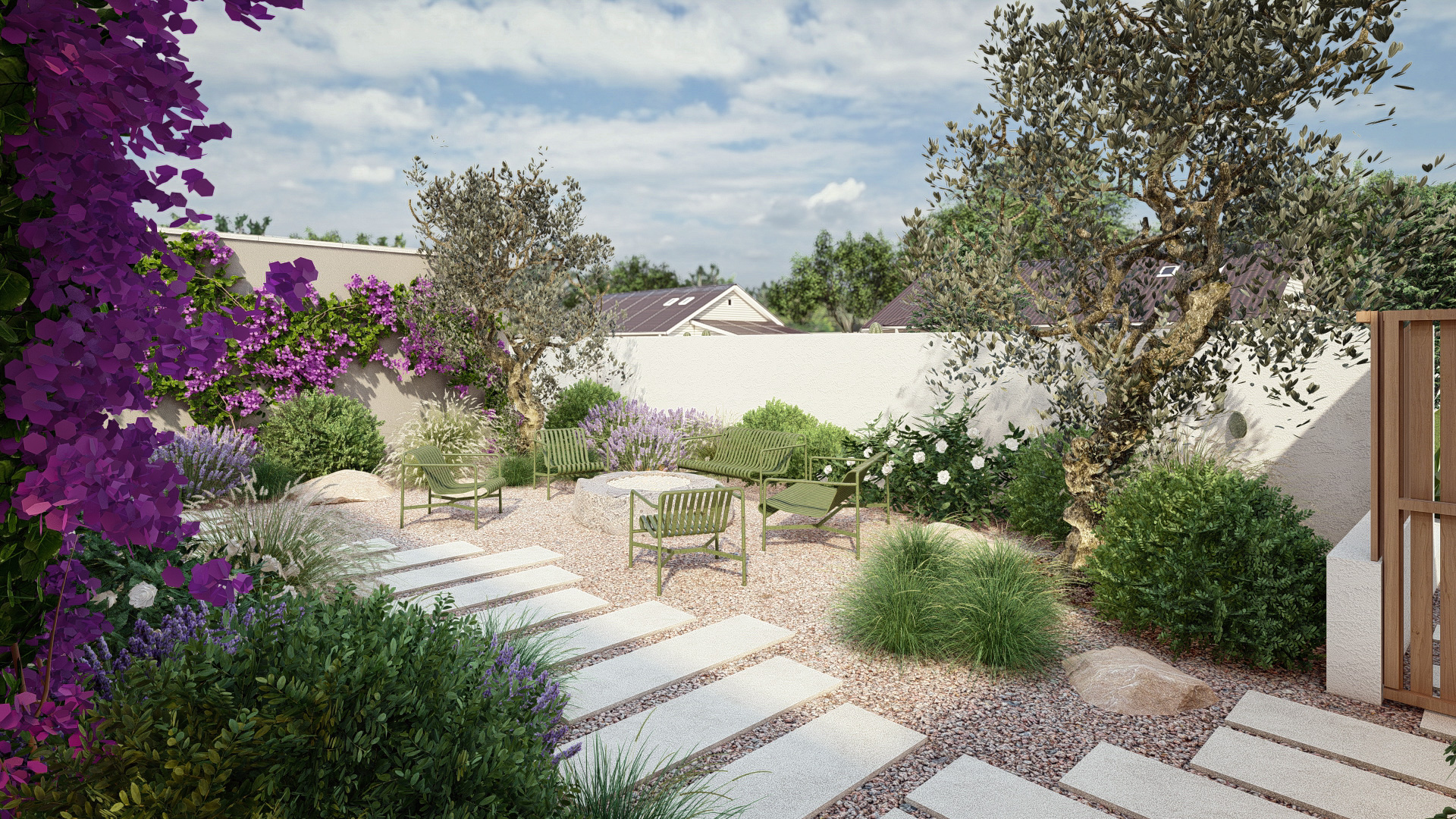 - Lush, Water-Wise Planting: The palette incorporates bold Mediterranean elements like lavender and bougainvillea alongside native grasses, ensuring year-round color and texture with minimal irrigation.