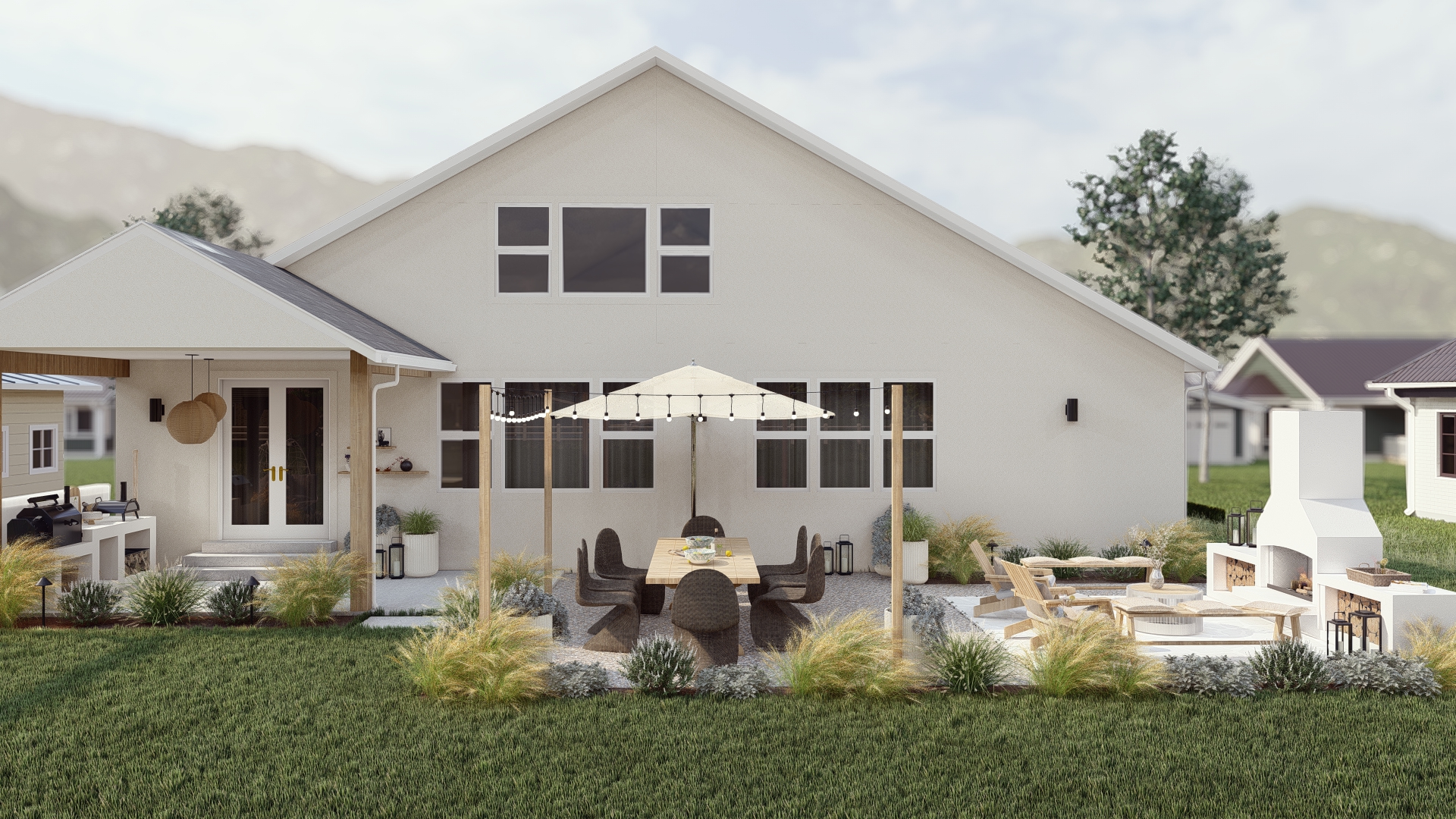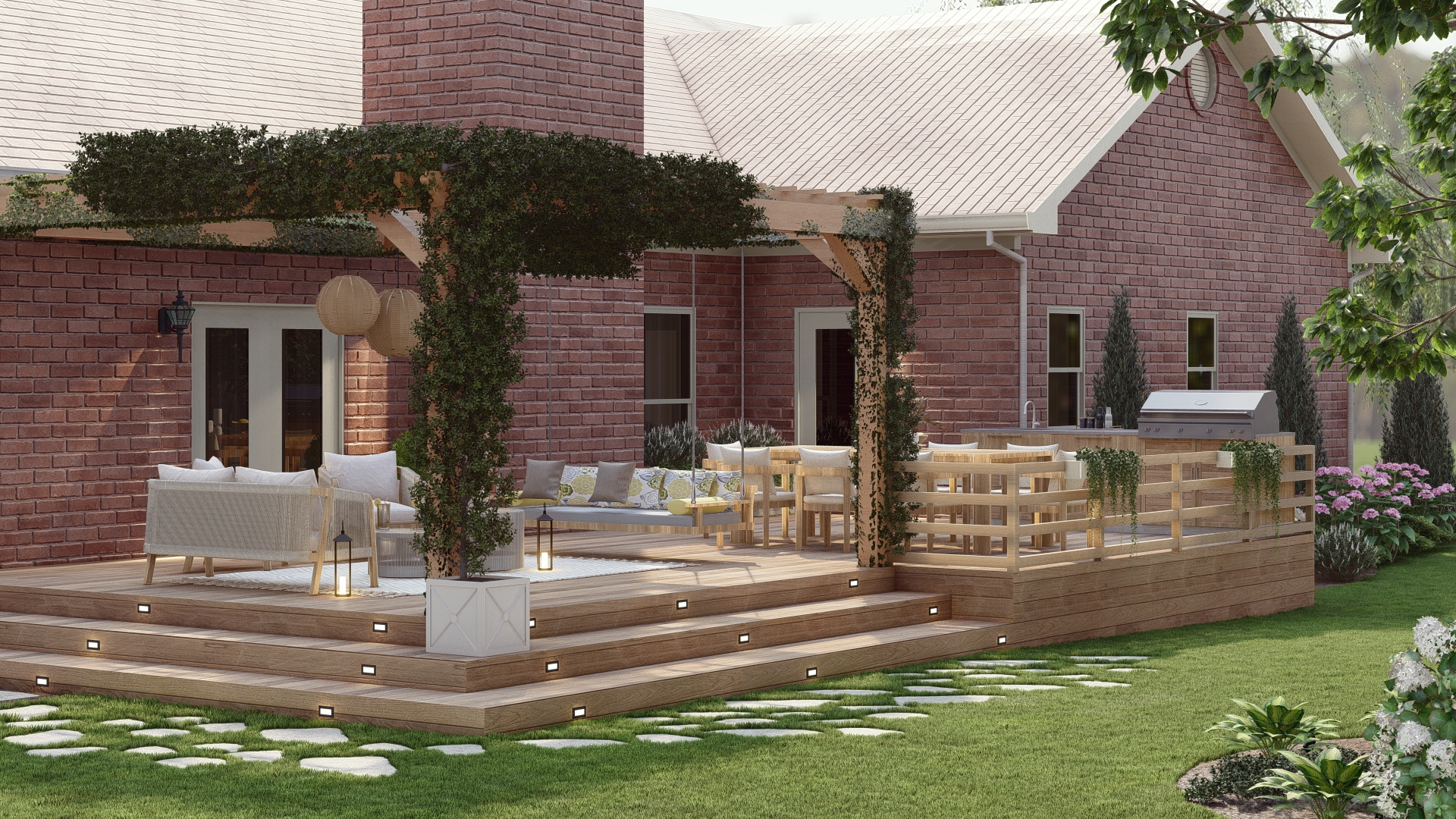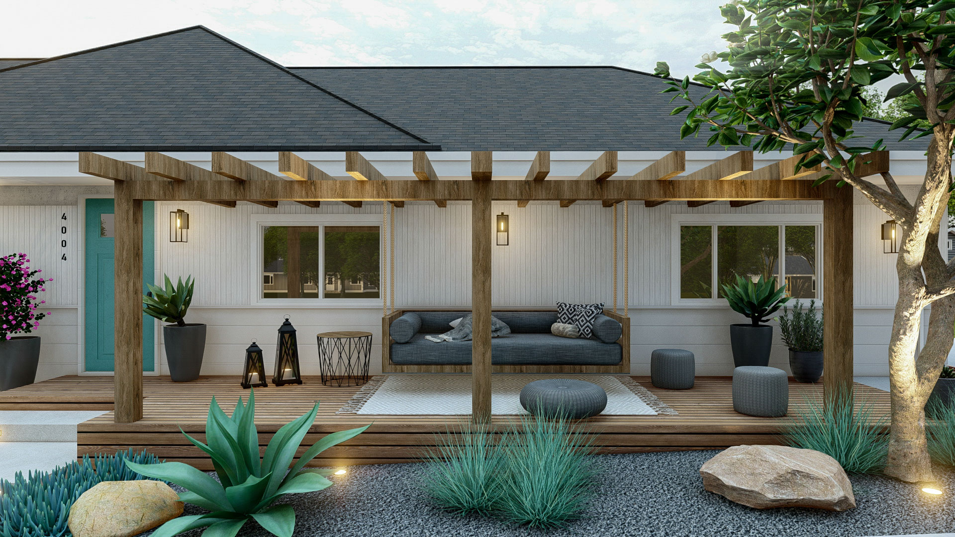 - Inviting Front Porch Retreat: A welcoming raised wood deck serves as the central focal point, featuring a custom cedar pergola that provides structure and shade for a stylish porch swing.