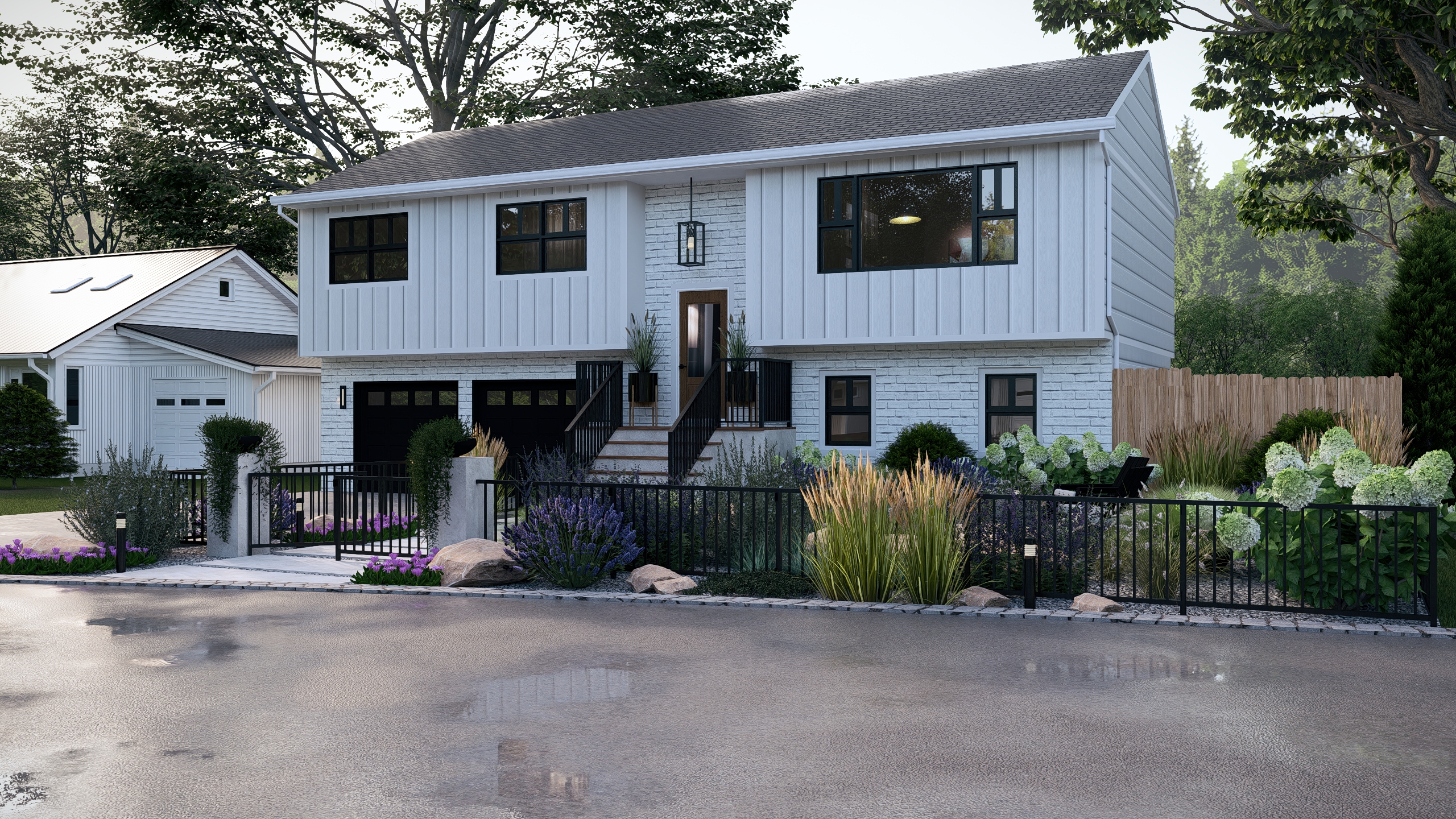 - Tiered Grading: The front yard's slope is handled gracefully using tiered concrete retaining walls and planters, turning a grading challenge into a deliberate design feature that adds depth.