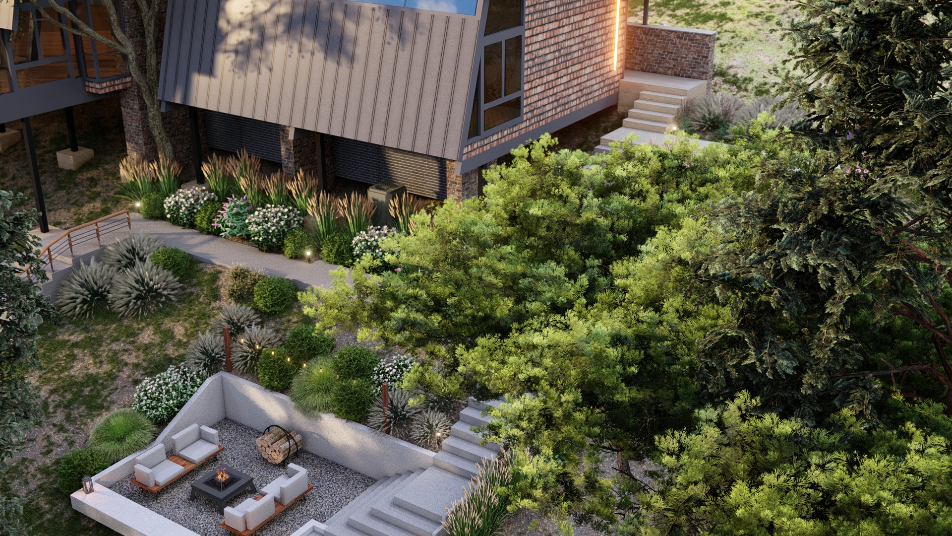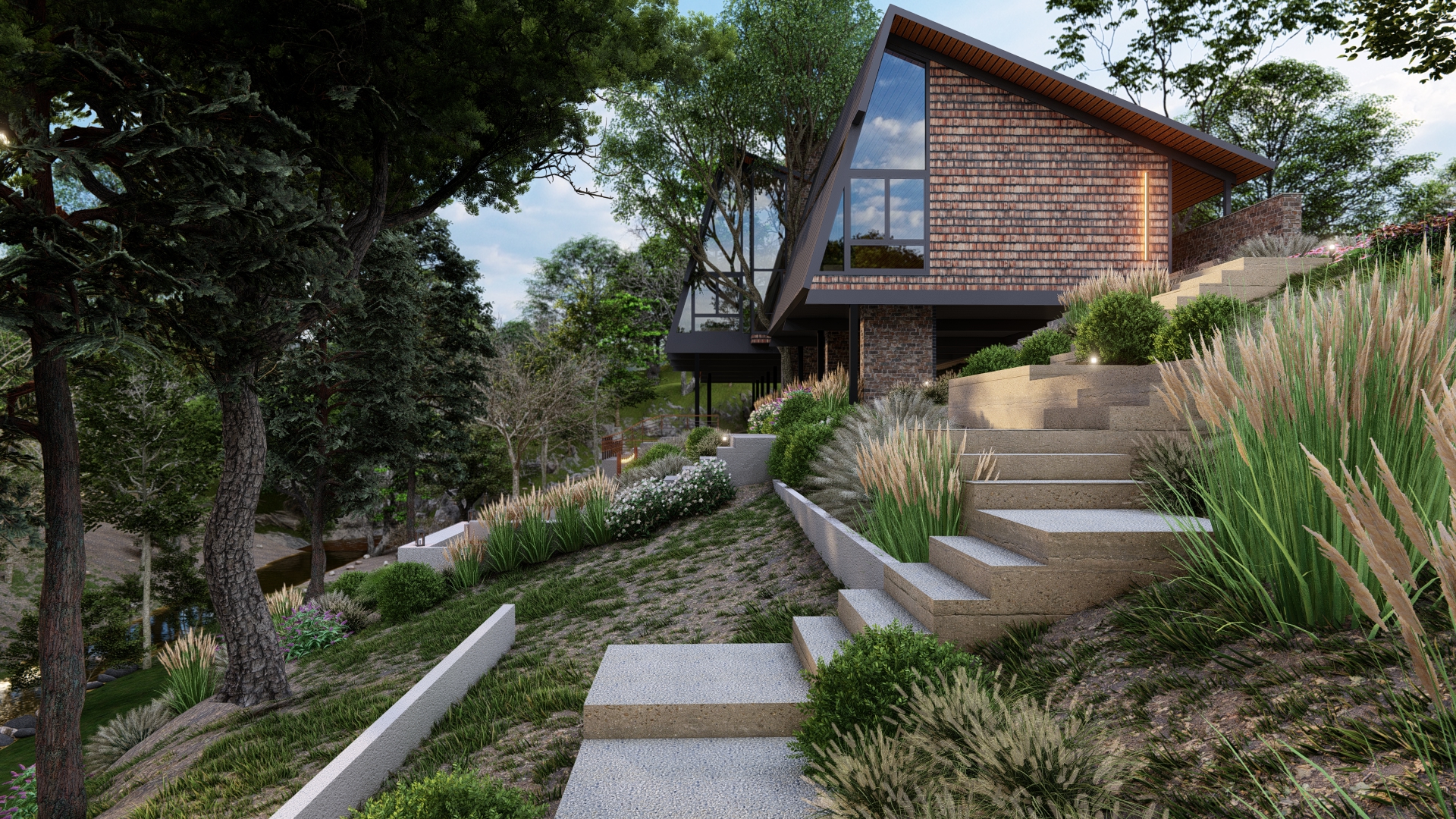 A warm and inviting front yard design blending natural hillside plantings with structured pathways, creating a welcoming gateway that enhances curb appeal while feeling timeless and refined.