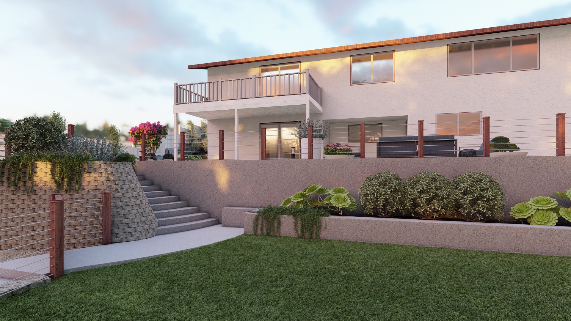 - Dramatic Terraced Landscape: A prominent terraced hillside features a dynamic arrangement of drought-tolerant plants, succulents, and flowering shrubs (like bougainvillea), secured by elegant stone retaining walls and providing a lush, natural backdrop.