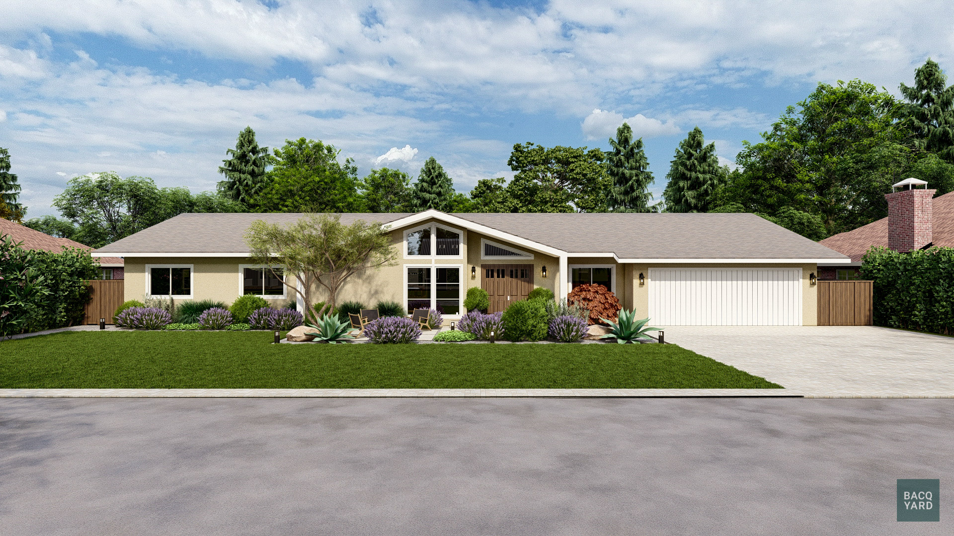 - Front Yard Curb Appeal: The front yard features a simple, low-maintenance design that complements the home's architecture. It utilizes a mix of lawn, gravel, structured drought-tolerant plantings (like Lavender and Agave), and a geometric paver path leading to the entrance, achieving maximum visual impact with minimal clutter.
