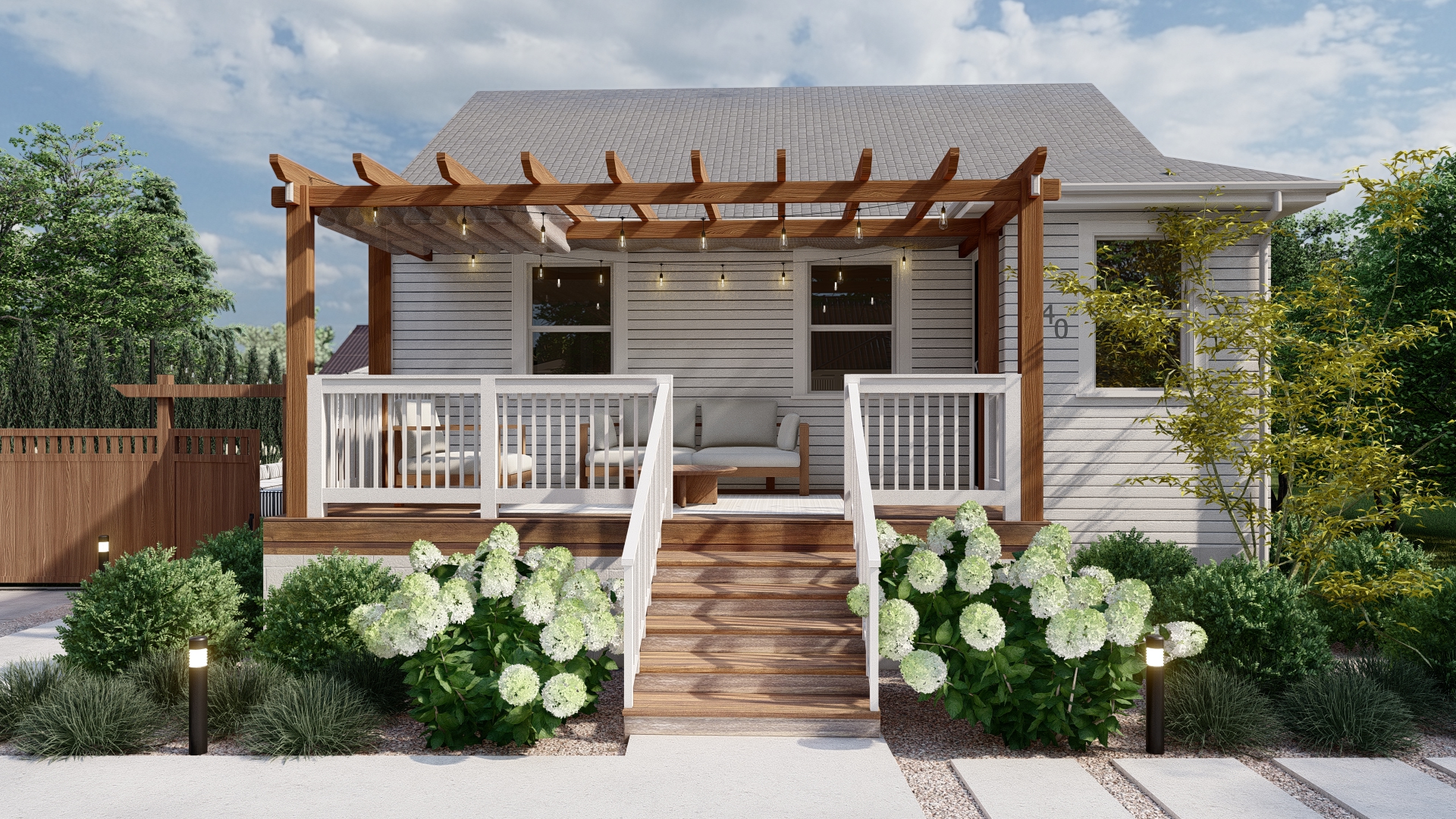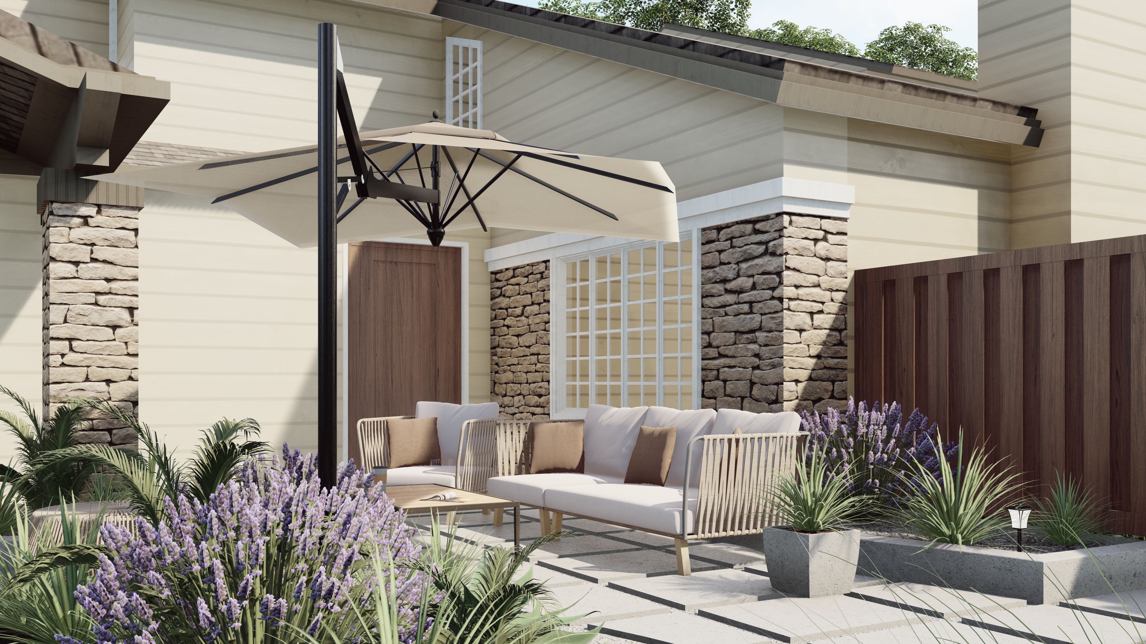 • Modern Seating Nook: A cozy lounge under a sleek umbrella provides a private retreat within the front yard.