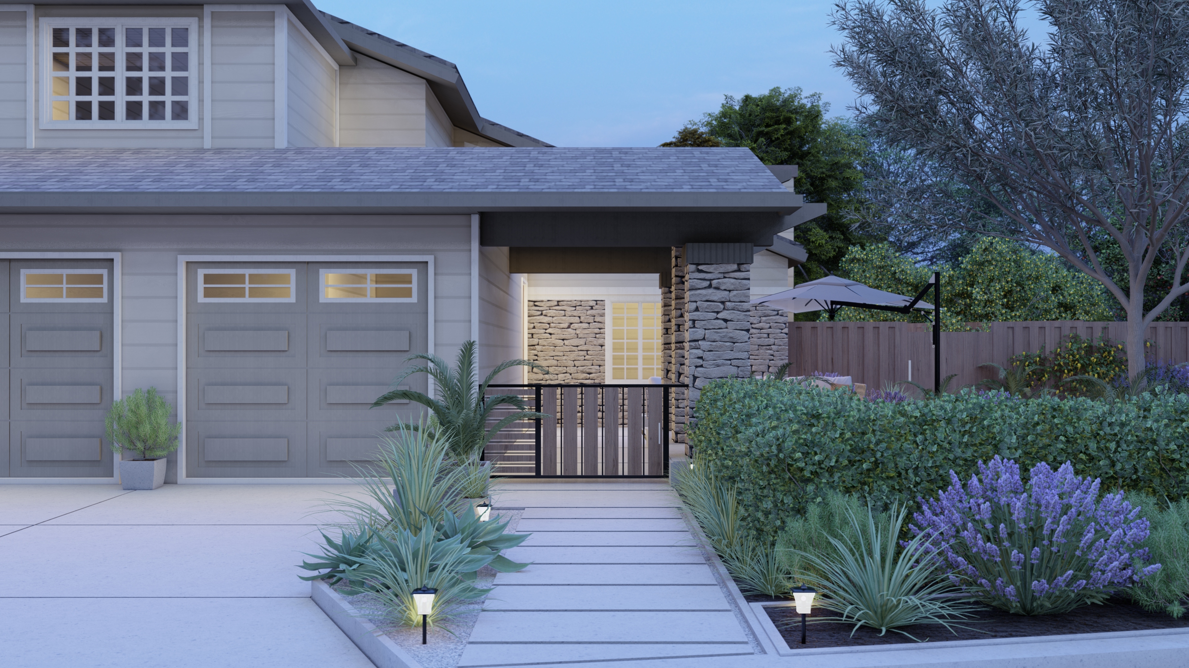 • Elegant Entry Path: A linear walkway bordered by lush, drought-tolerant plants leads to the front door, setting a calm and balanced tone.