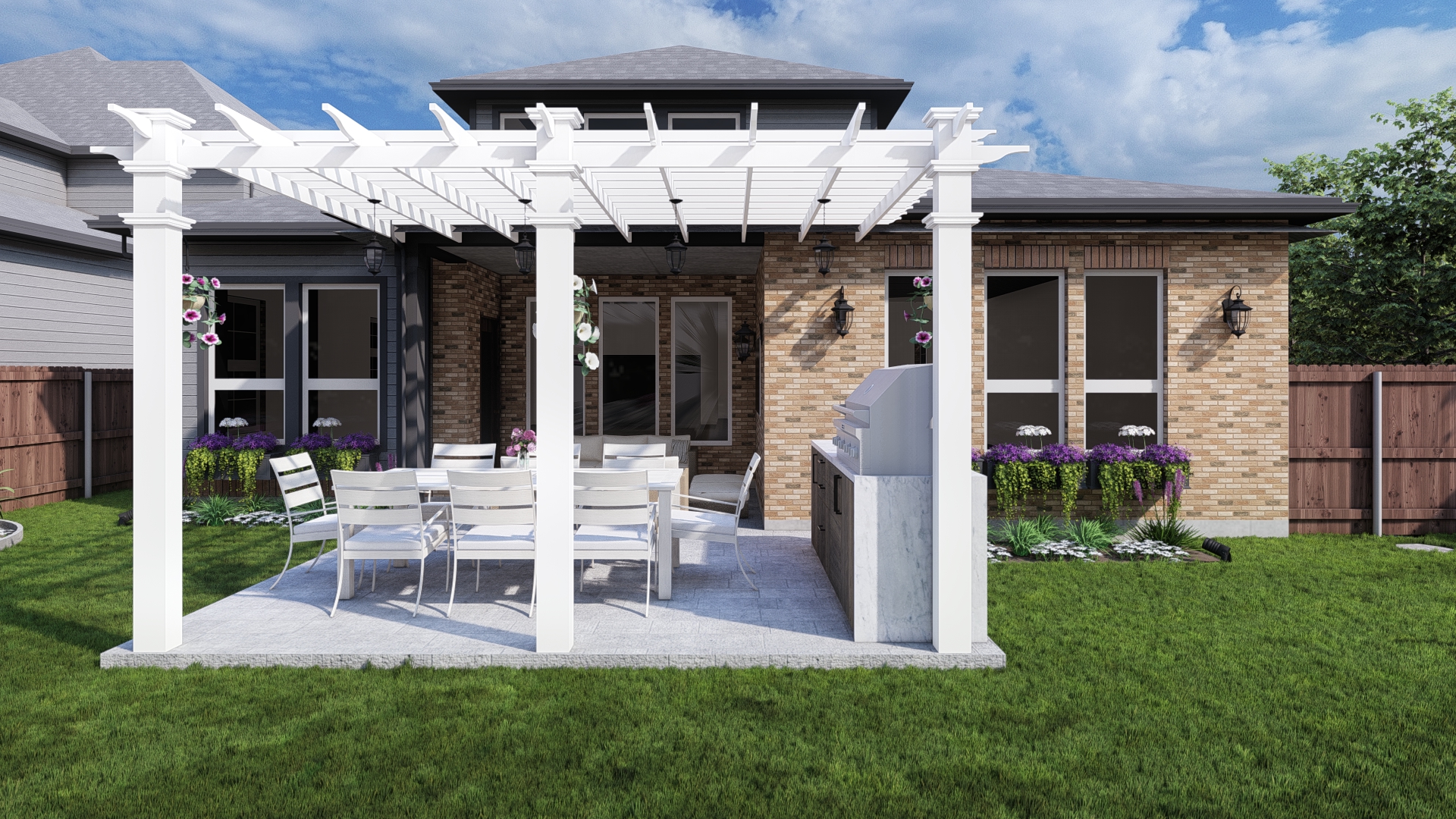 - Pergola Dining & Kitchen: A striking white pergola anchors the main entertaining zone, shading a large dining table and a functional outdoor kitchen with a built-in grill and storage.