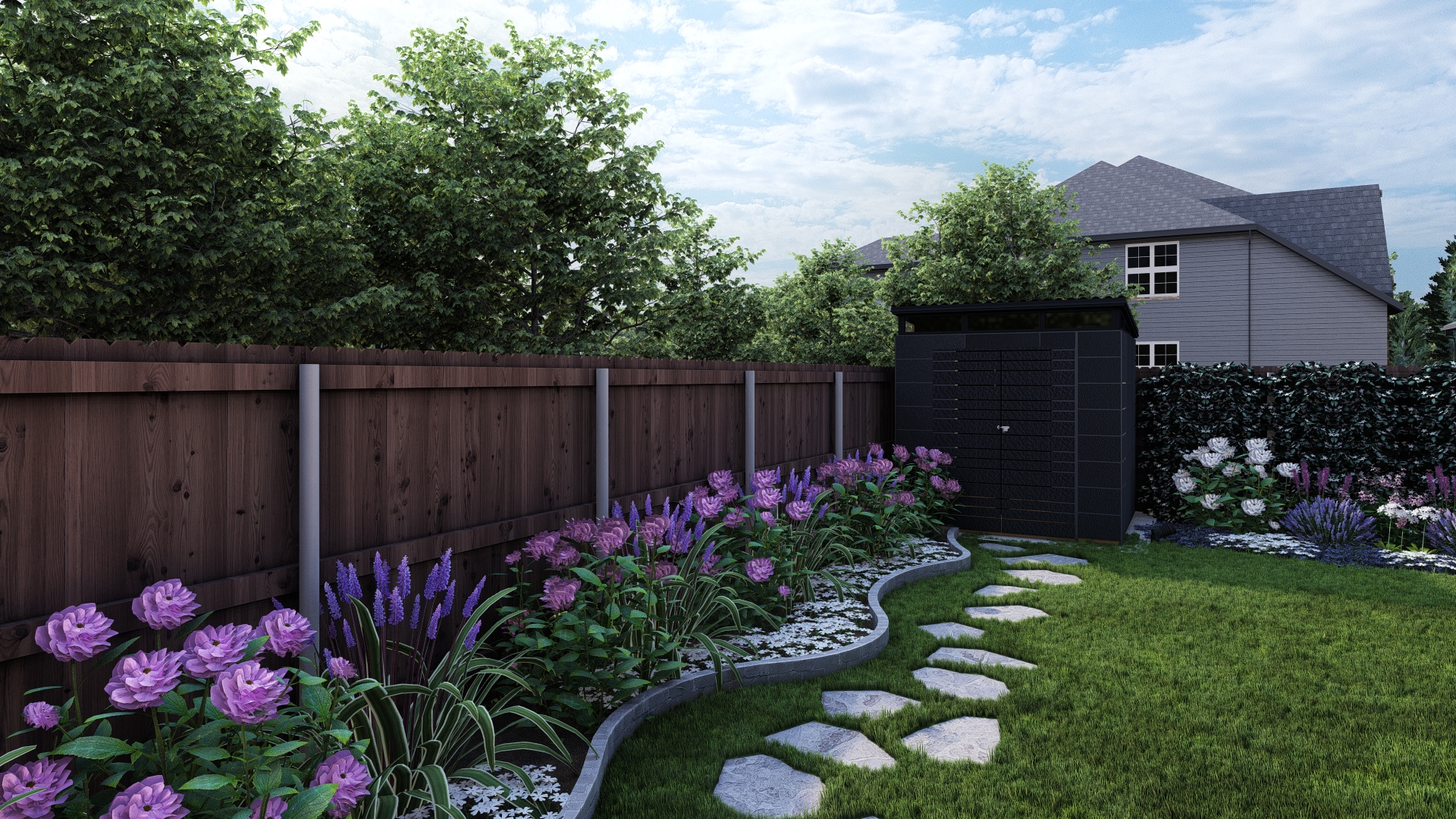 - Cottage-Style Back Border: The rear perimeter features layered flowering borders with smooth, curved edging and stepping stone paths, introducing softness and cottage charm against the dark privacy fence.
