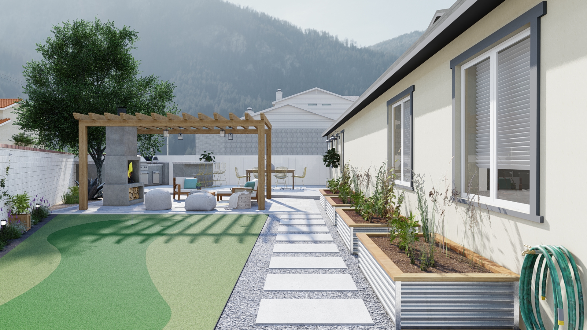 - Recreation Zone: A customized putting green is seamlessly integrated into the lawn area, providing a fun, low-maintenance recreational feature without sacrificing the overall aesthetic.