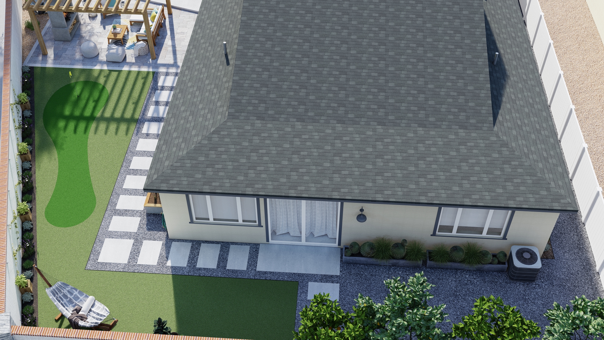 - Modern Hardscaping & Flow: Large, square concrete stepping stones set in a bed of gravel create a clean, intentional pathway, linking the home's exit to the various entertainment zones while emphasizing the geometric modern style.
