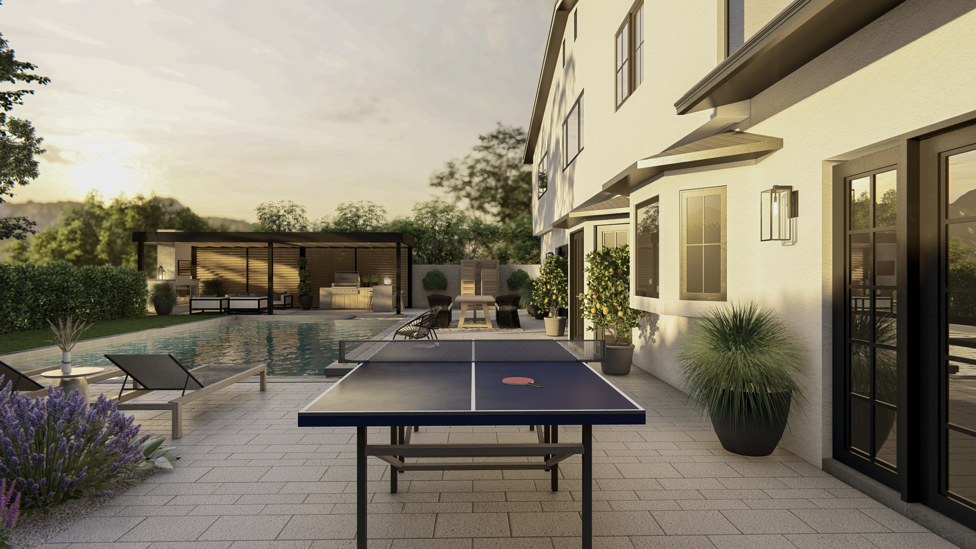 - Flexible Recreation Space: The expansive, paved patio features areas for large dining sets and an unexpected, fun element like the ping pong table, ensuring the space is functional for all types of activities and gatherings.
