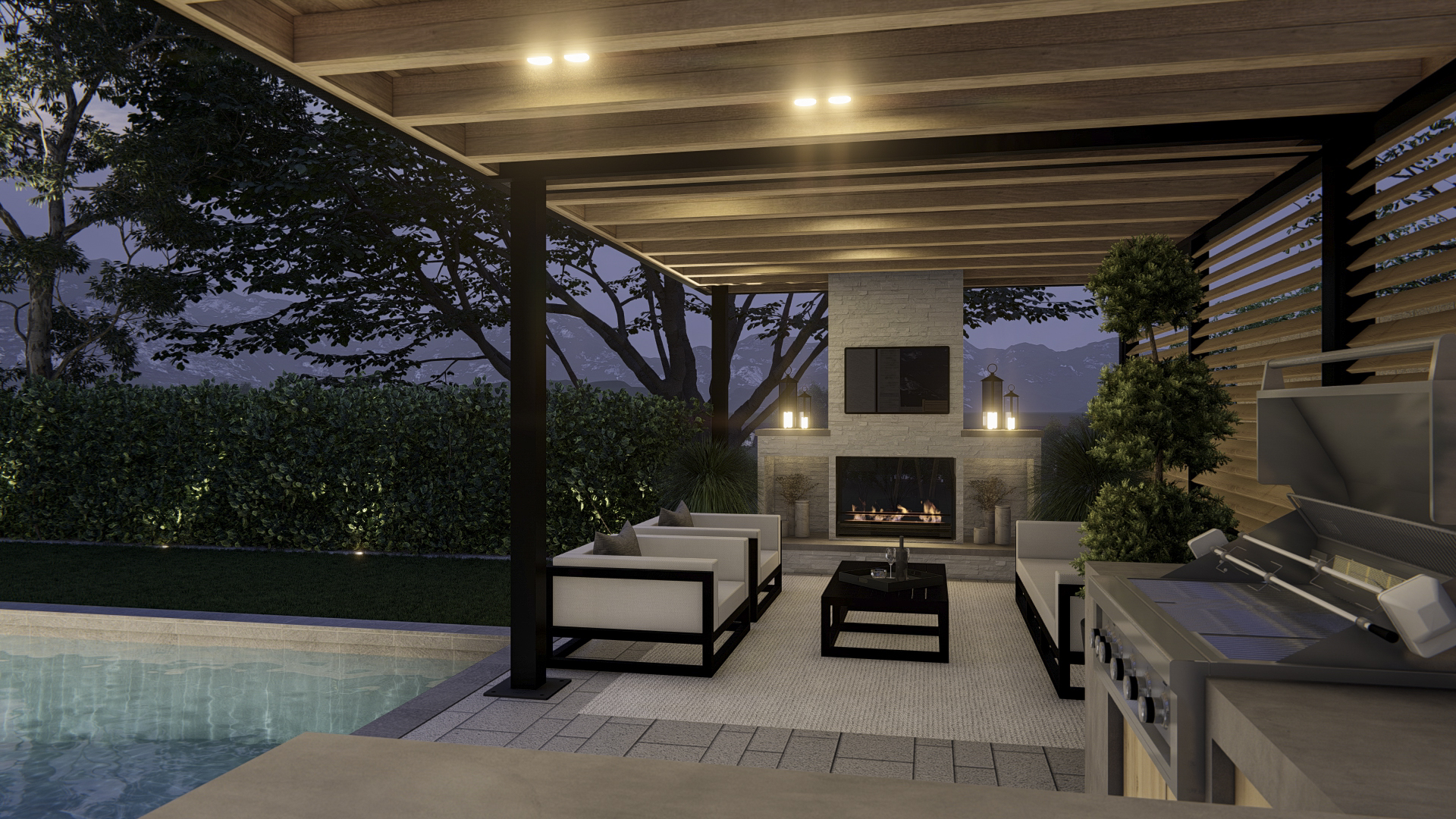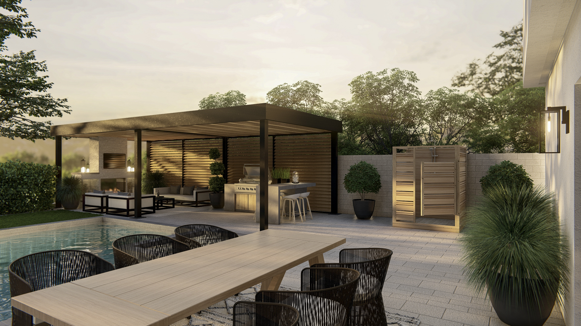 - Luxury Privacy Screening: Slatted wood panels used beneath the pergola and as subtle fencing add warmth and texture, ensuring privacy for the lounge area without sacrificing the modern, open feel.