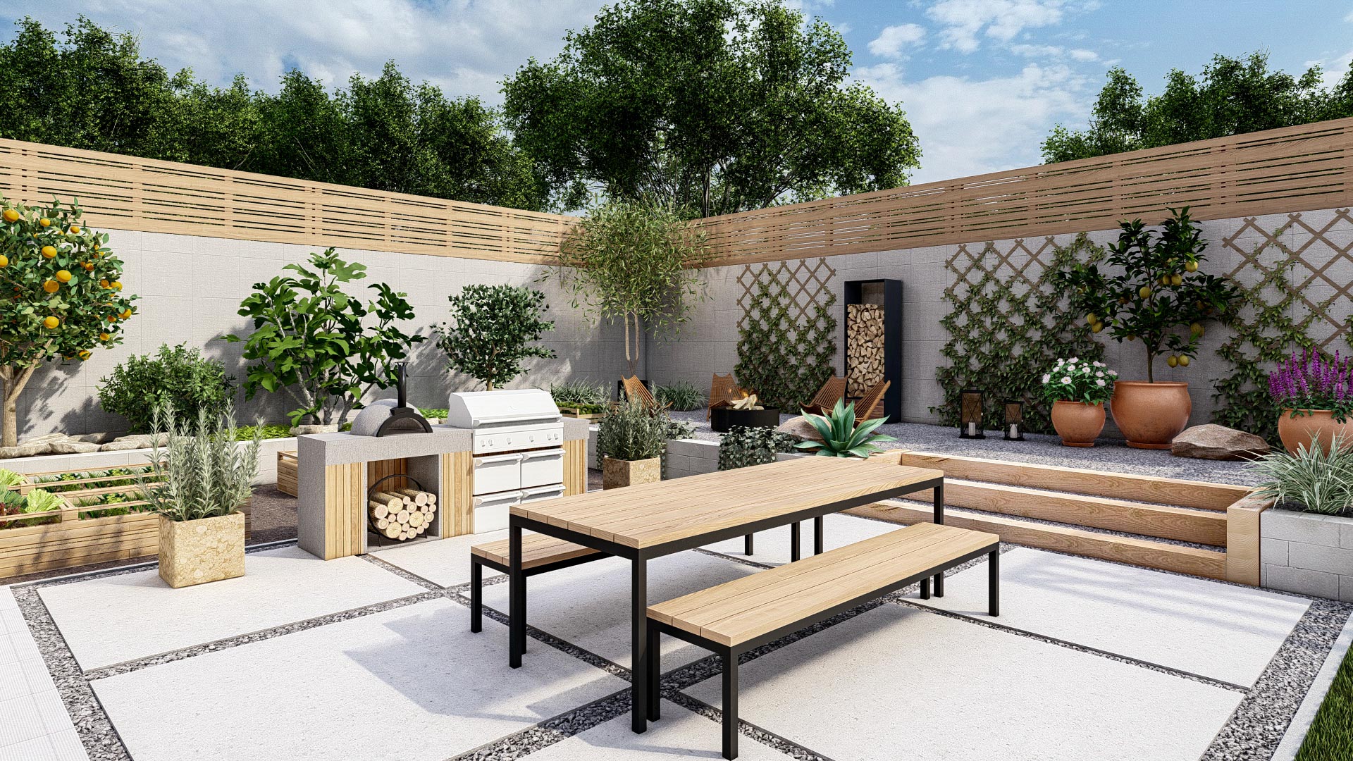 - Dining Pergola: A large, slatted modern pergola provides structure and essential shade over the main outdoor dining space, defining it as a primary gathering point.
