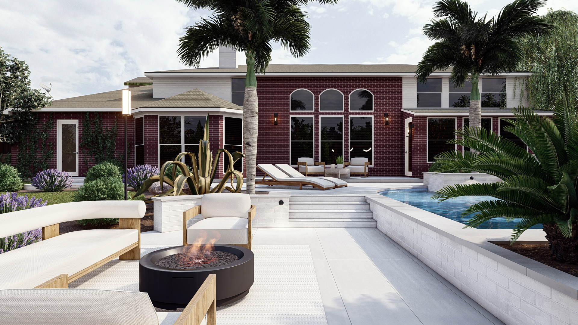 - Layered Hardscaping: Expansive white paving provides a seamless flow between entertaining areas, contrasting beautifully with the home's red brick.