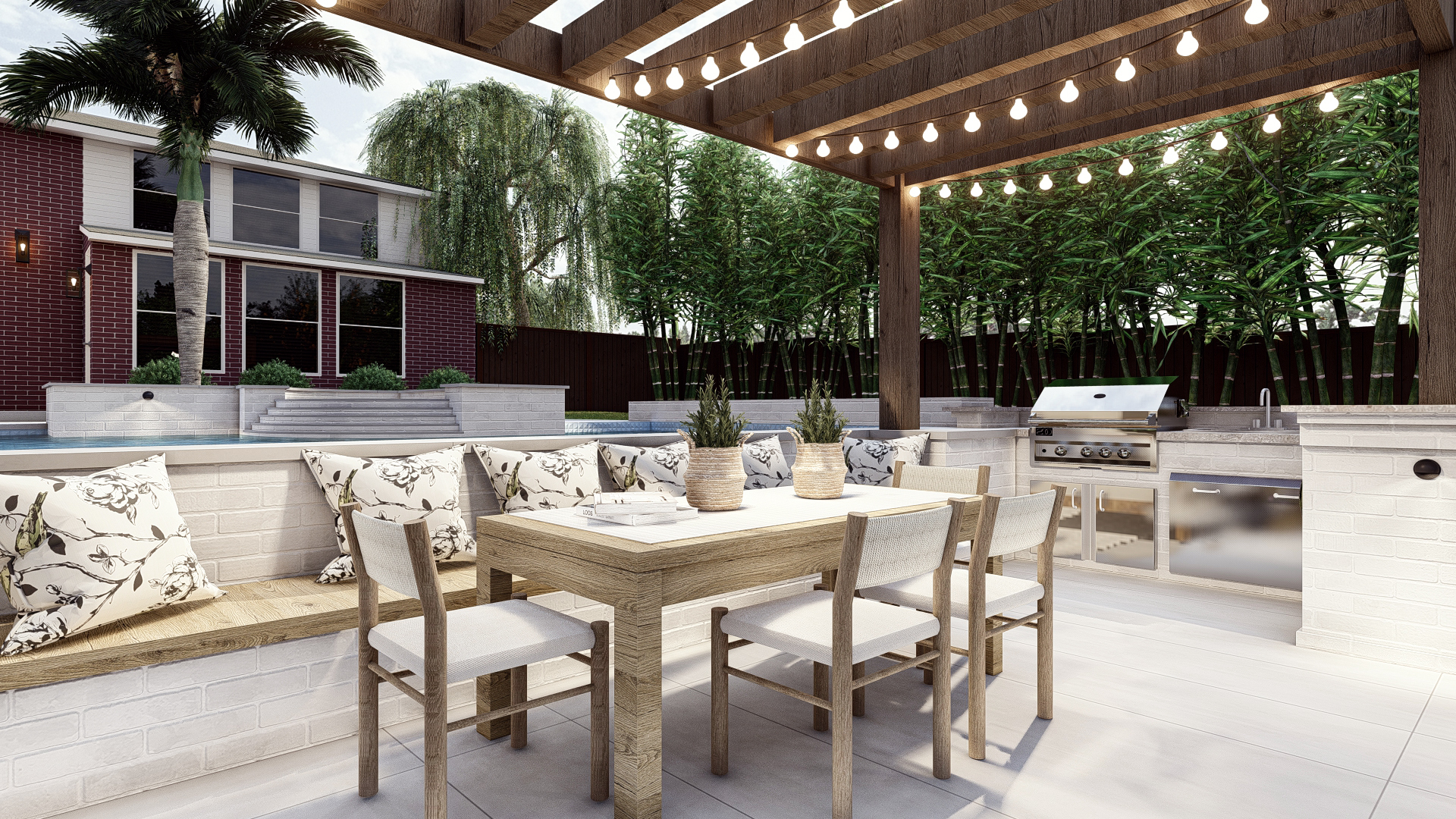 - Custom Pergola Feature: A wooden pergola with string lighting defines a casual dining or lounge area, anchoring the far end of the pool deck.