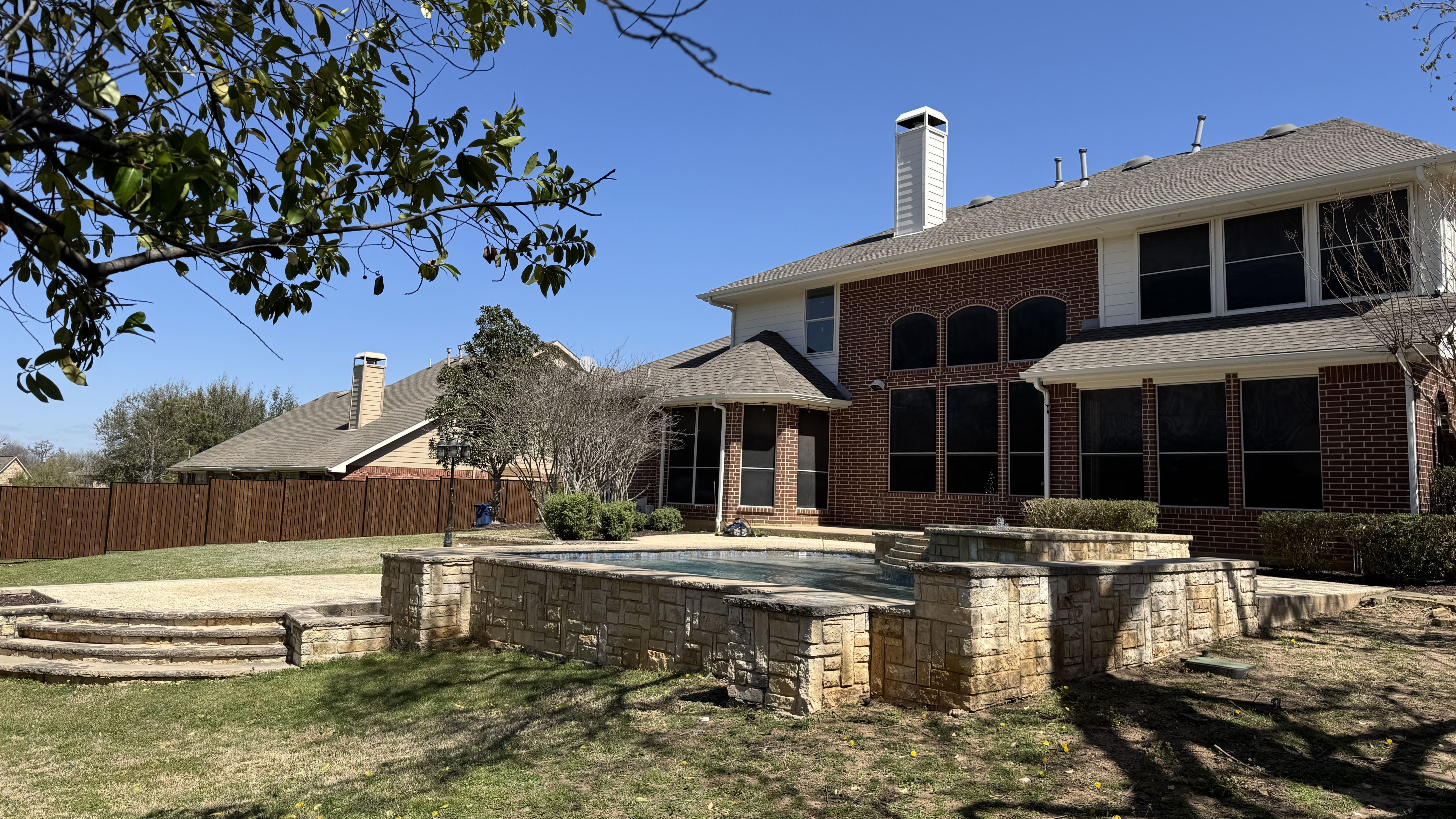 This extensive backyard remodel transforms a traditional space into a sophisticated, resort-style oasis perfect for entertaining and relaxation in the Texas heat. The design centers around a geometric pool, integrating sleek, contemporary lines with lush, tropical plantings to create a year-round vacation atmosphere.
