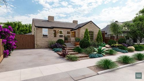 - Structured Walkway: A defined, angular pathway leads from the driveway to the porch, bordered by lighting and clean, white planters for a polished look.
