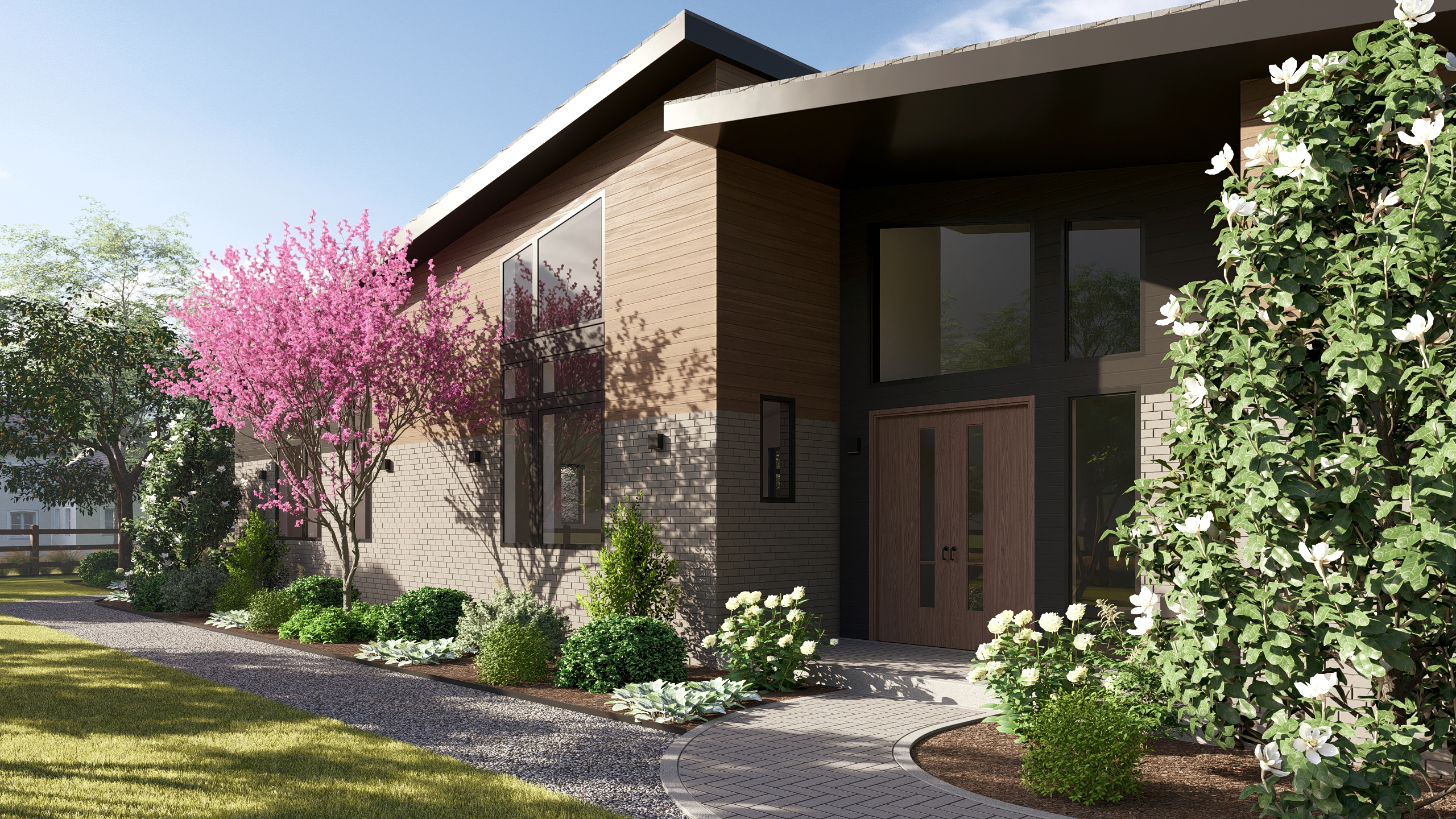 - Modern Hardscaping & Pathways: Large-format white pavers, often interspersed with grass in a checkerboard pattern, define elegant pathways and patio areas, reinforcing the clean, modern aesthetic.