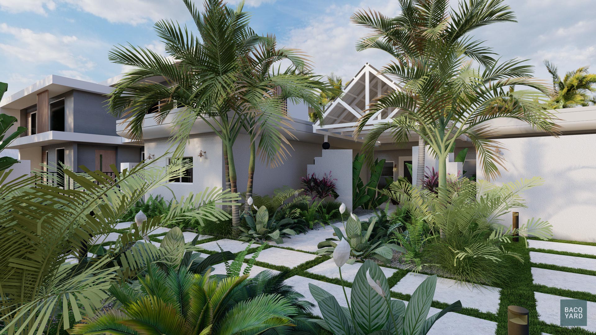 - Lush Tropical Plantings: The landscape is rich with a diverse array of exotic, broad-leafed plants like banana trees and palms, alongside delicate hanging vines and groundcovers, creating a dense, private, and vibrant tropical environment.