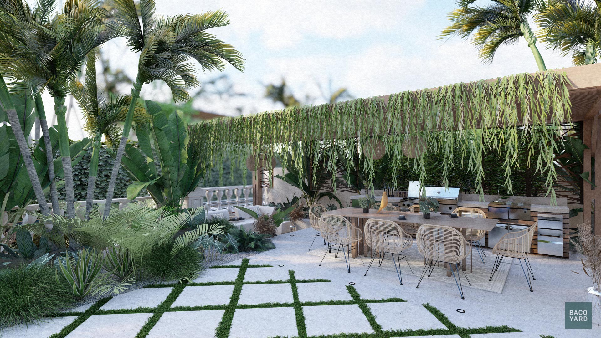 Discover a luxurious Florida waterfront property transformed into a tropical modern oasis. This full-yard design boasts a resort-style pool, custom pergola with outdoor kitchen, lush exotic plantings, and multiple sophisticated lounging zones.