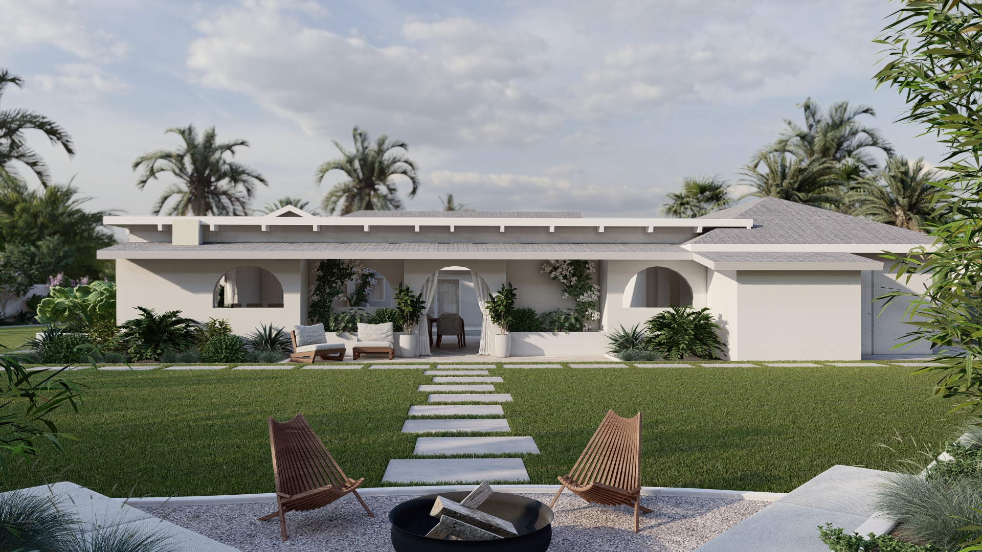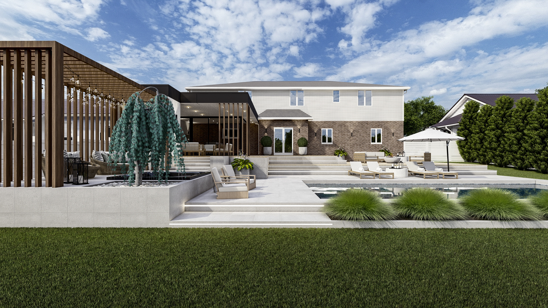 - Resort-Style Swimming Pool: A contemporary, rectangular in-ground pool serves as the centerpiece, flanked by comfortable lounge chairs and softened by minimalist, ornamental grasses.