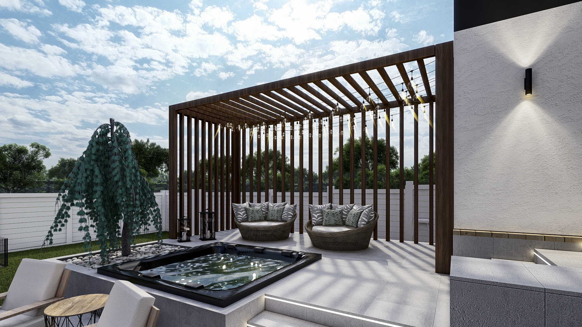 - Secluded Spa Retreat: A luxurious built-in spa is thoughtfully positioned under a slatted pergola, offering a private, tranquil spot for relaxation.
