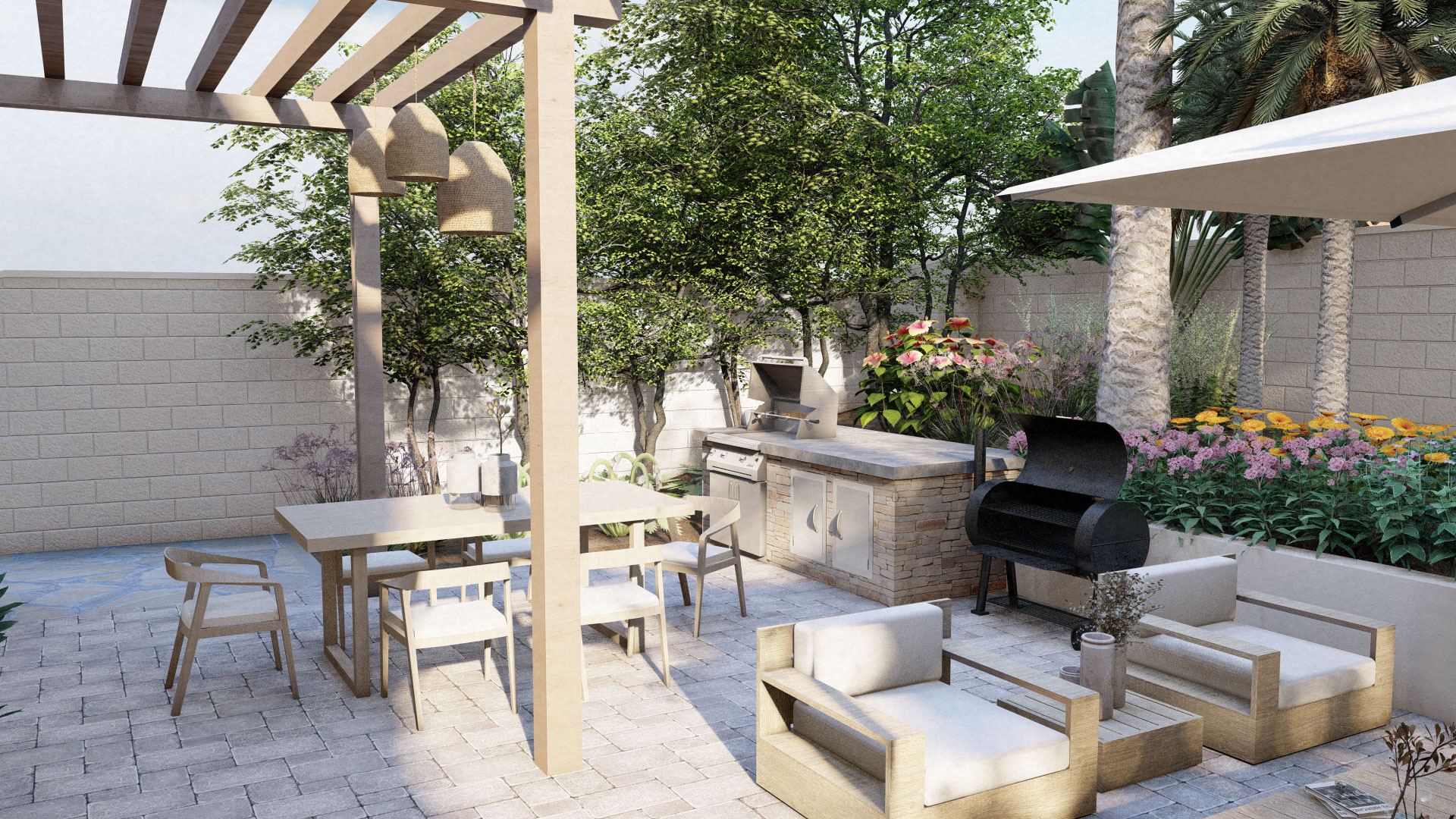 - Integrated Edible Garden: Stylish, low raised wooden planter boxes are placed near the patio, making it easy to grow herbs and vegetables right off the main outdoor living area.