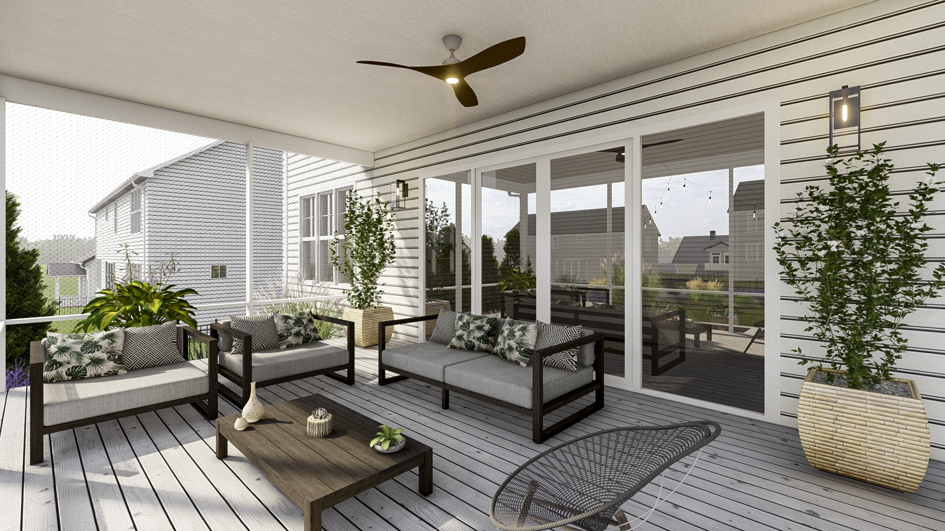 - Covered Porch Connection: The design starts with a comfortable covered porch directly off the house, furnished with modern seating to create a seamless indoor-outdoor transition.