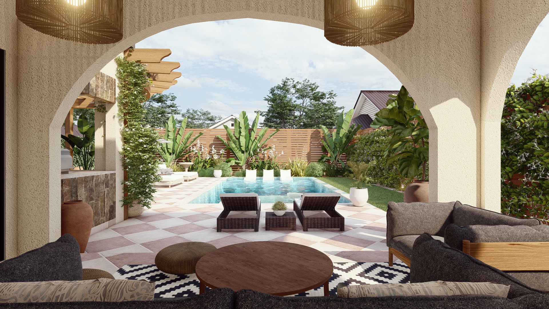 - Rich Textural Hardscaping: Extensive use of patterned tile and terracotta-colored paving connects the various outdoor zones, from the pool deck to the main home entry.