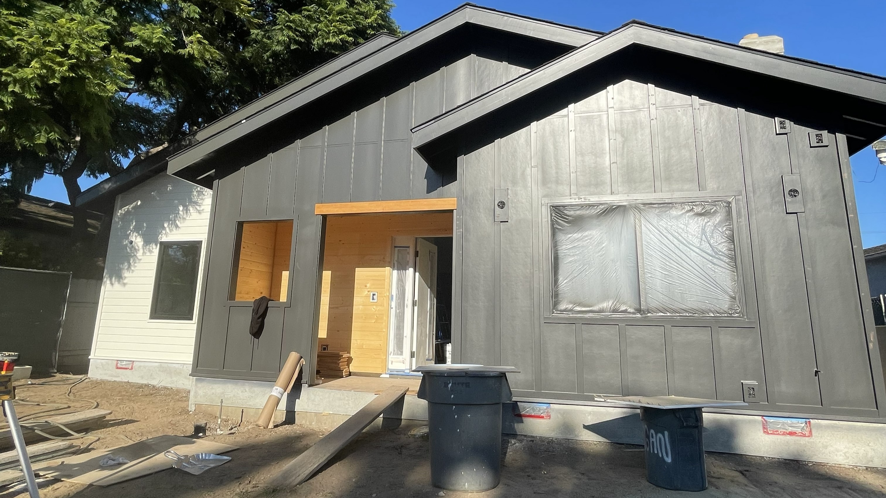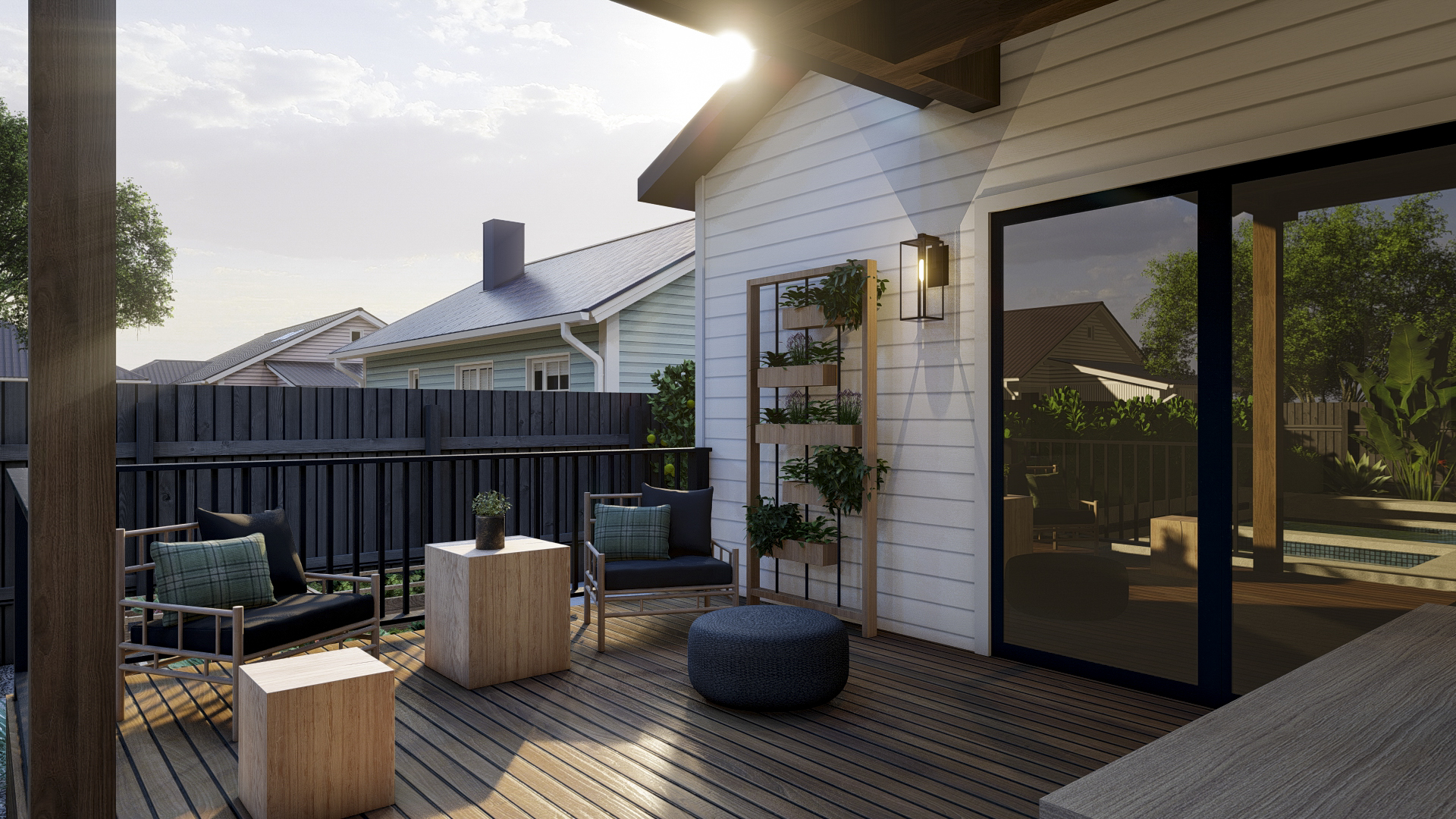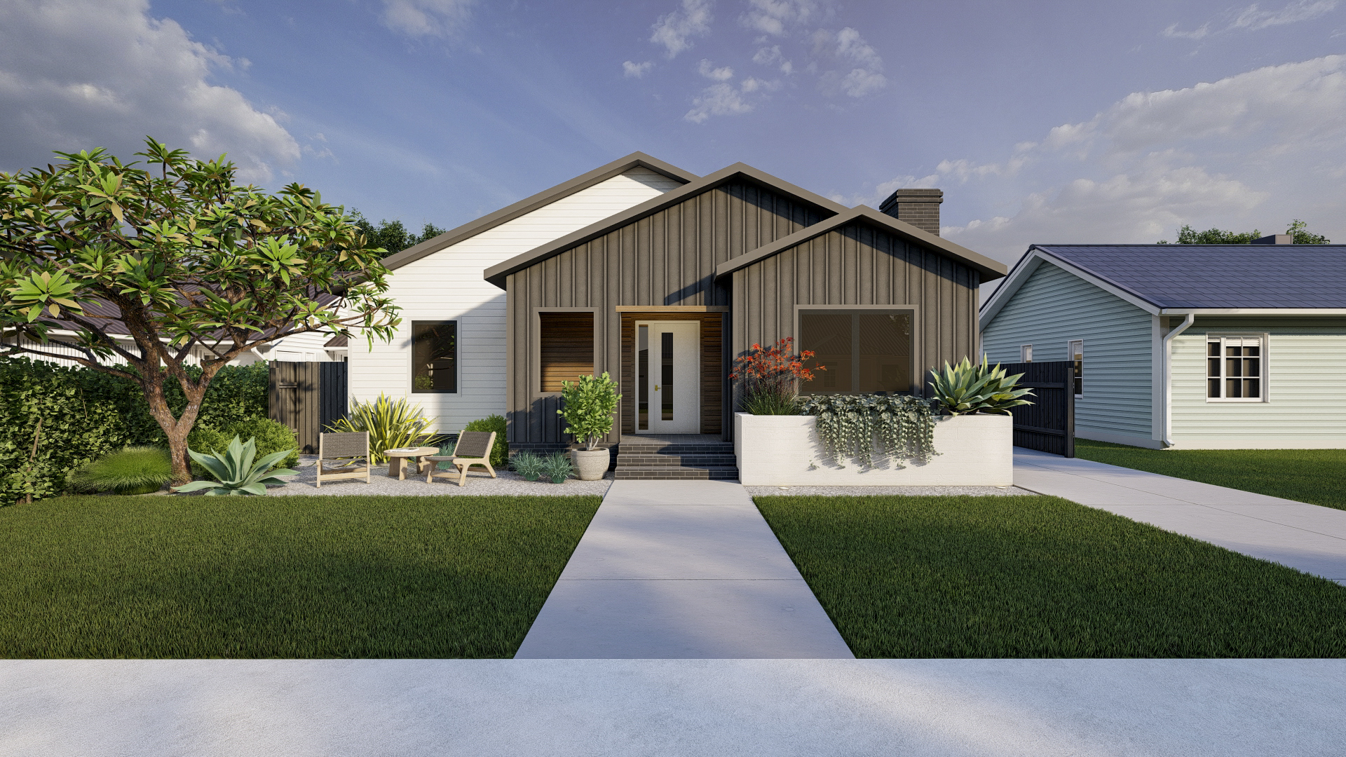 - Modern Curb Appeal: The front yard sets the tone with a simplified palette of dark-stained vertical siding, a clean concrete walkway, and drought-tolerant plantings set in a simple white raised bed.
