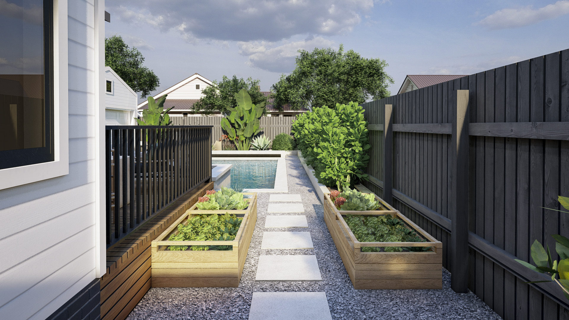 - Productive Gardening: A practical element is integrated near the side yard with raised wooden garden boxes set on gravel, offering a space for herbs and vegetables without disrupting the minimalist aesthetic of the main yard.