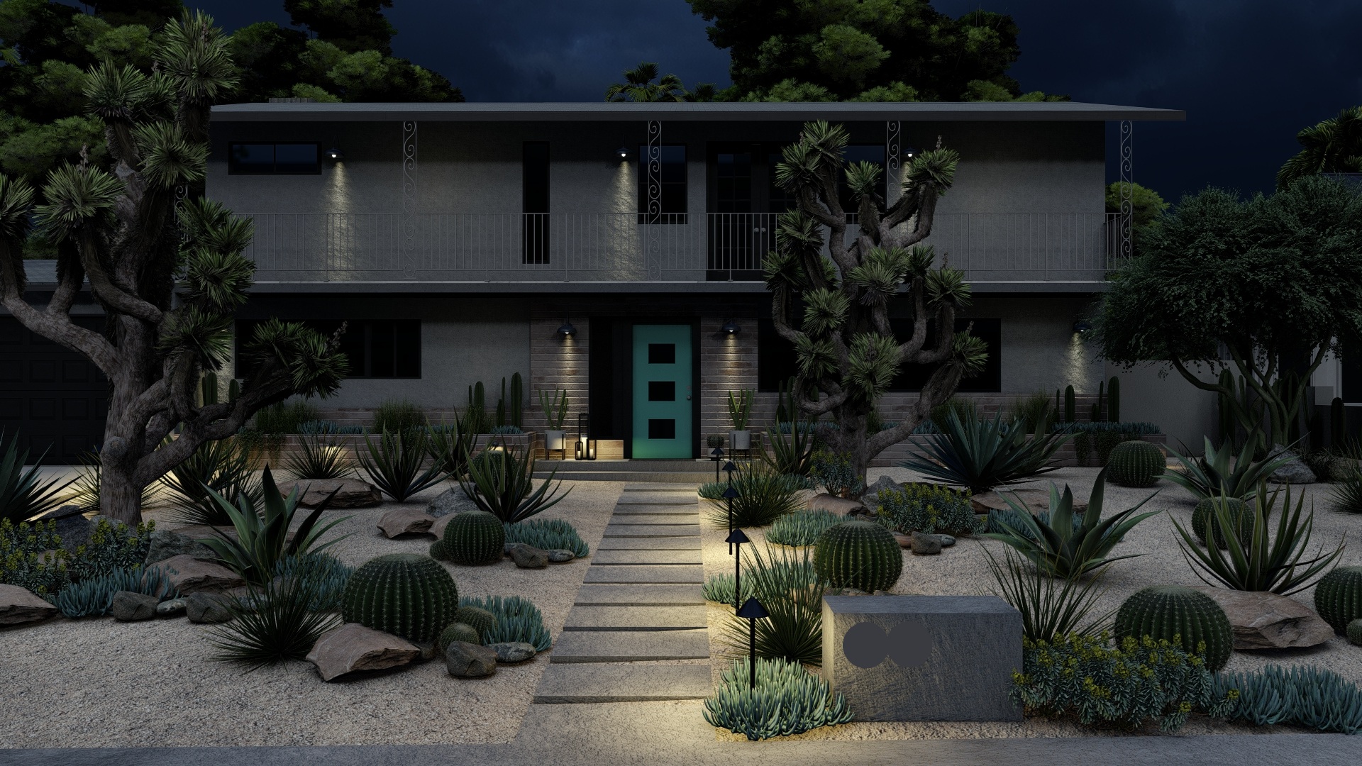 - Clean, Layered Hardscaping: The use of bright desert sand/gravel provides a neutral, low-maintenance ground cover, contrasting beautifully with the cool gray of the custom stepping stone pathway leading to the front door.