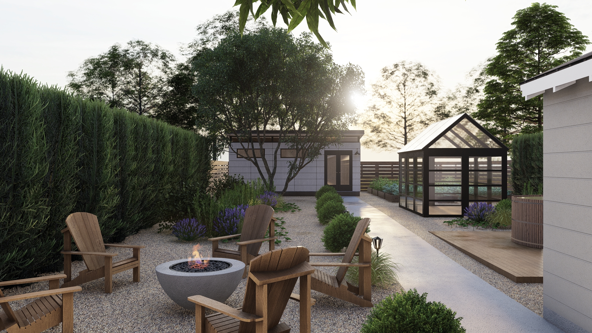 - Dedicated Greenhouse & Raised Beds: A sleek, modern greenhouse provides a dedicated space for plant cultivation, complemented by adjacent raised garden beds for a truly productive garden experience.