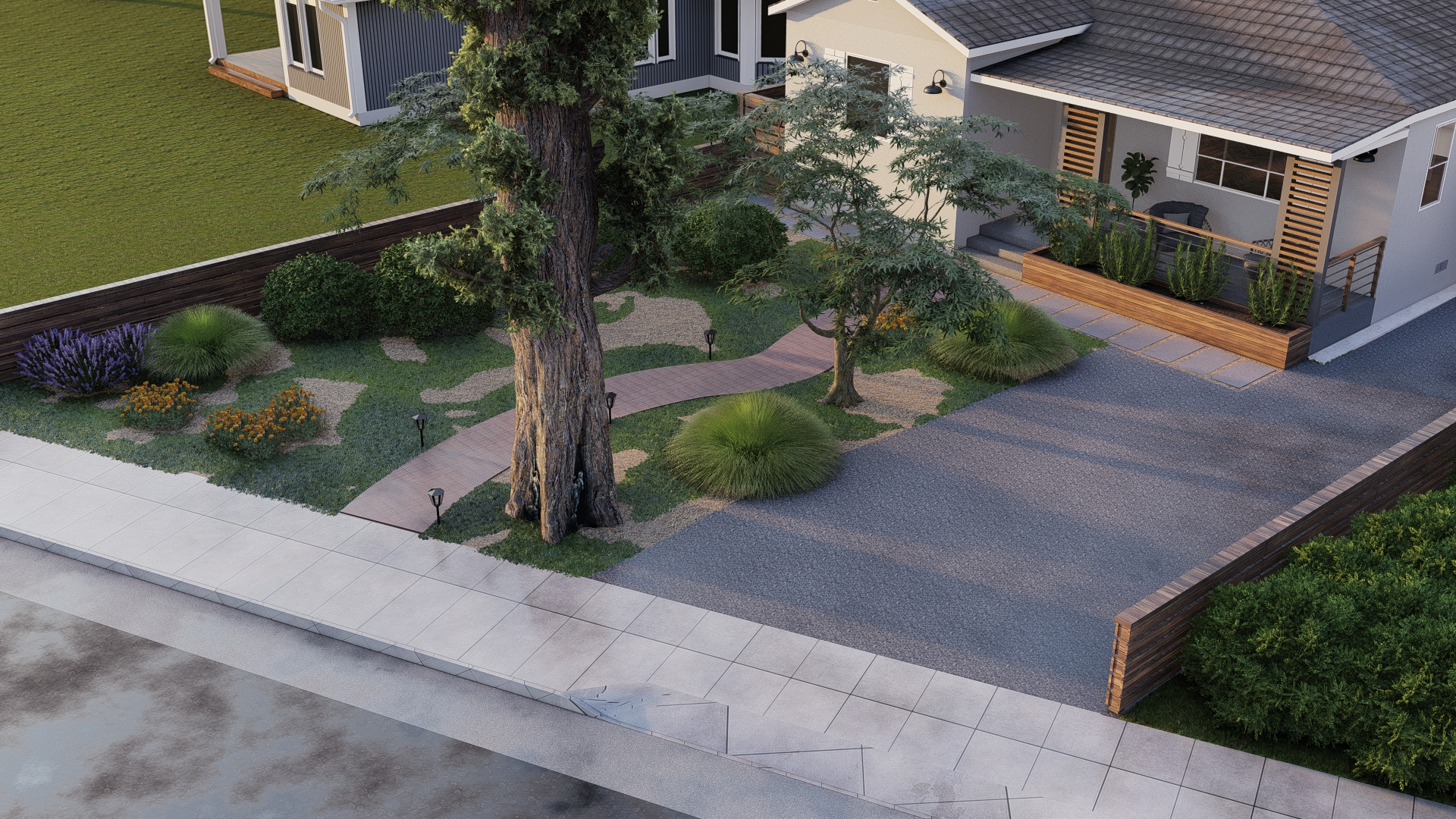 - Nature-Inspired Front Yard: The front approach blends modern hardscaping with a naturalistic planting scheme, featuring mature trees, winding paths, and soft, undulating garden beds.
