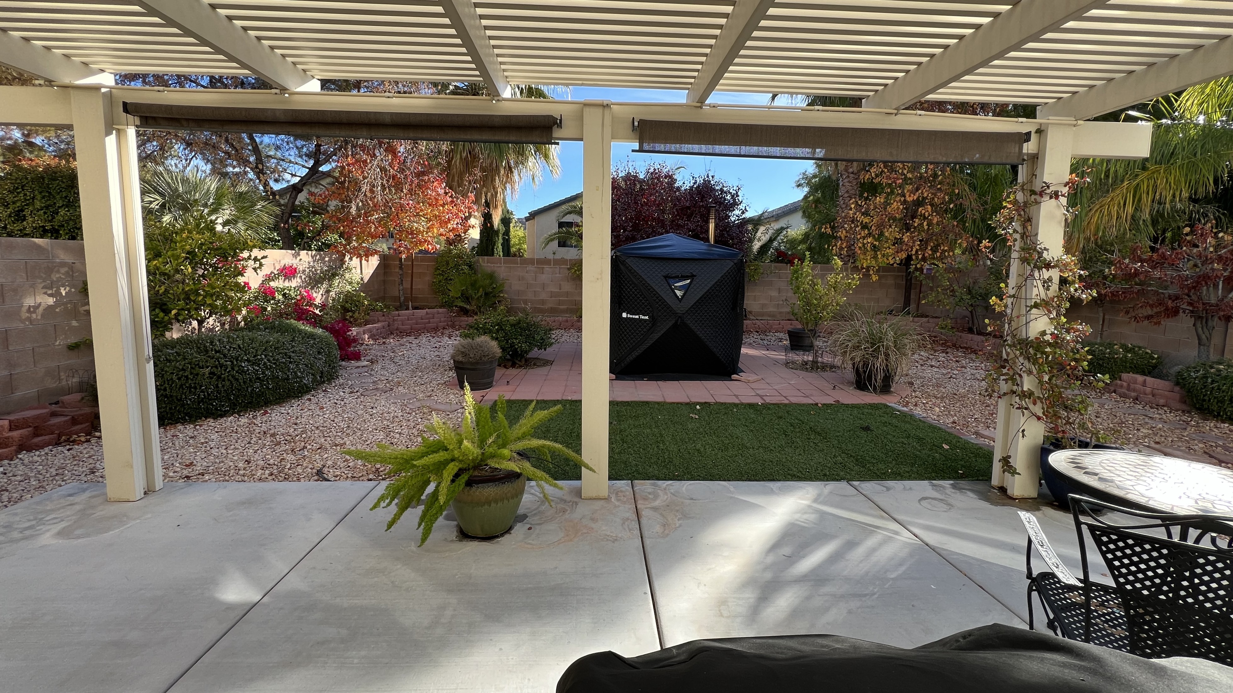 Explore a modern backyard oasis in Nevada defined by neutral tones and clean lines. This multi-zone design features a slatted pergola lounge, fire pit seating area, and drought-tolerant landscaping for an elegant, low-maintenance outdoor retreat.