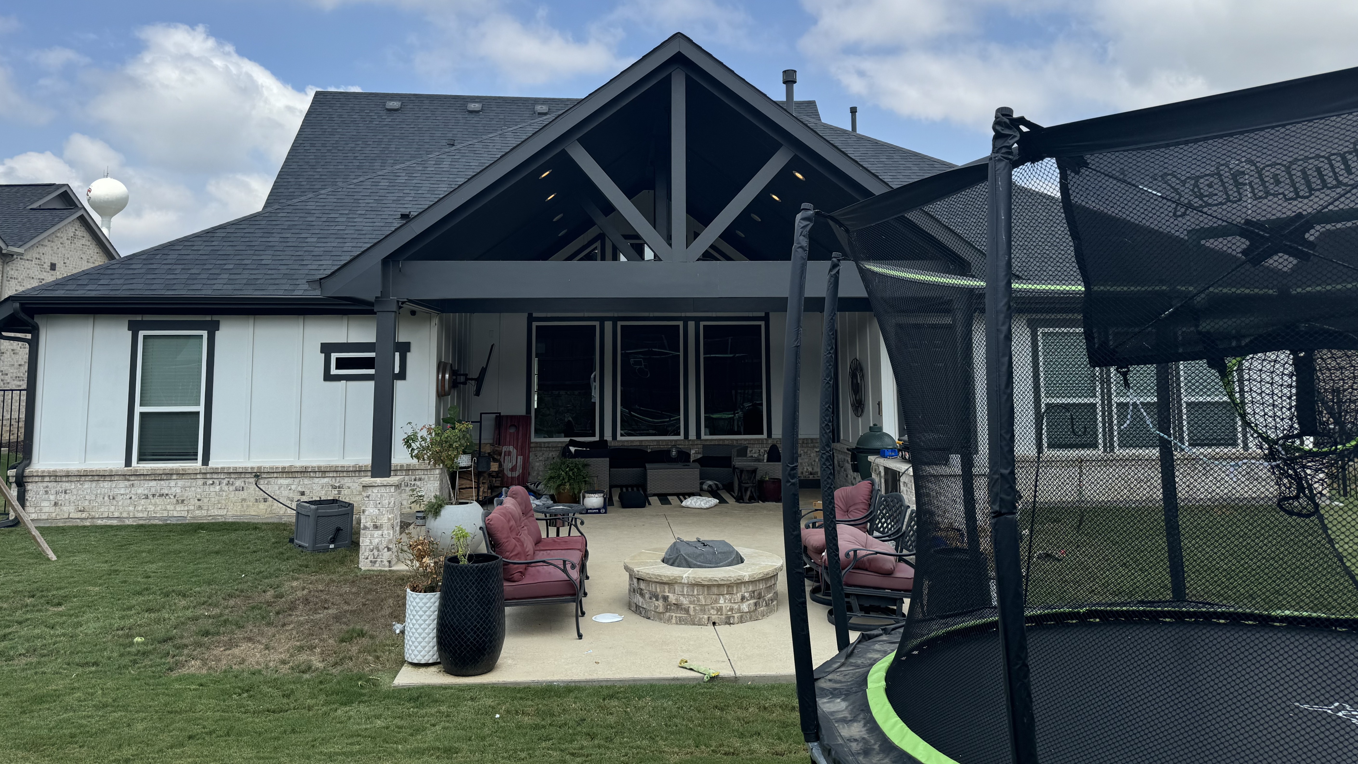 - Covered Outdoor Living: The grand, gabled covered patio extends the home's interior, providing a shaded, luxurious outdoor living room with high ceilings, comfortable seating, and stylish lighting.
