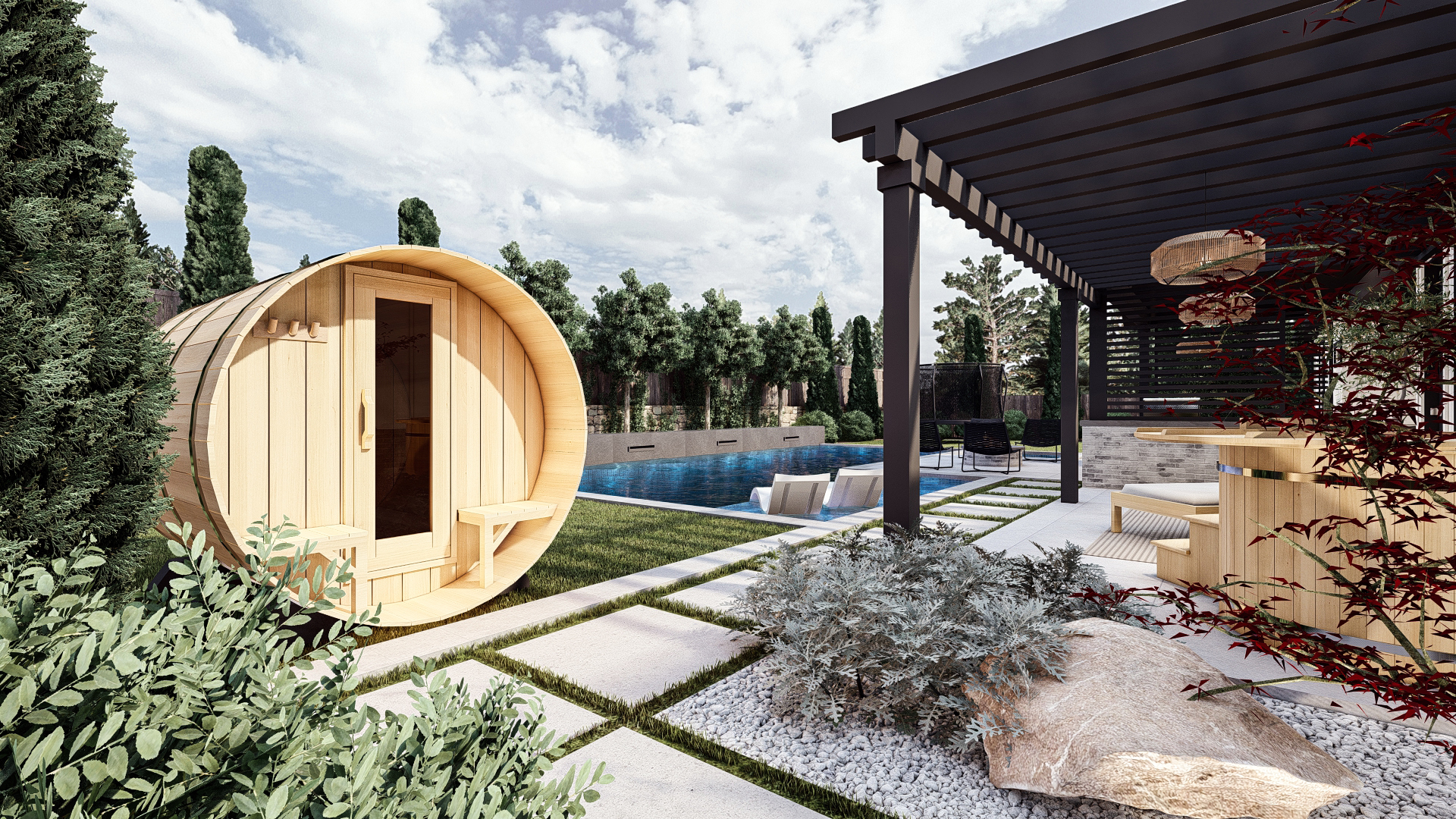 - Wellness Zone: A dedicated area features a private, modern barrel sauna surrounded by structured greenery and cypress trees, establishing a secluded space for relaxation and detox.
