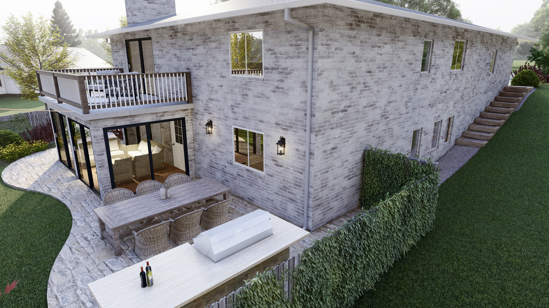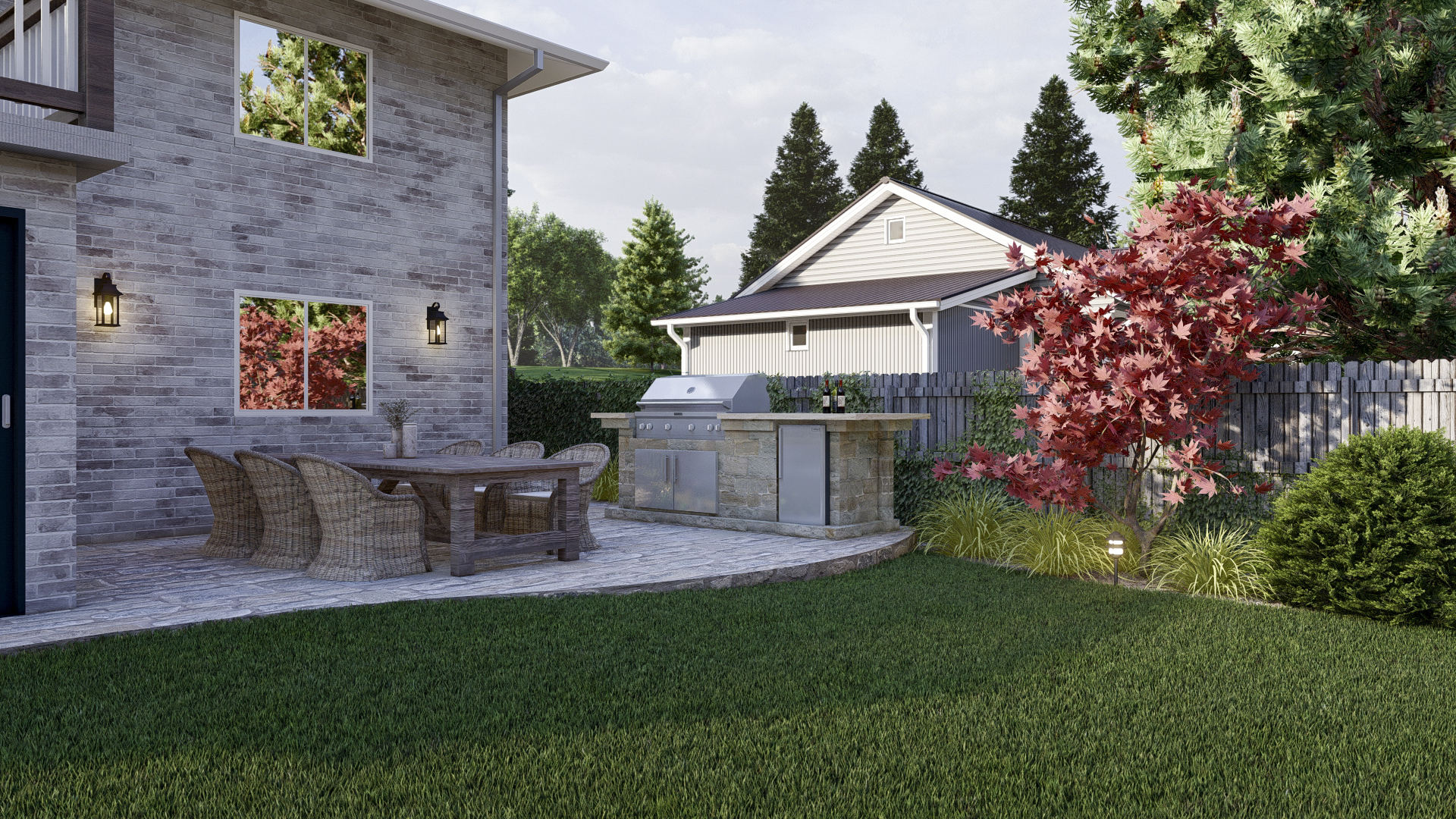 - Stone Outdoor Kitchen & Dining: An expansive patio area made of natural stone pavers hosts a built-in outdoor kitchen with a professional grill and a large rustic dining table, perfect for al fresco meals and hosting.
