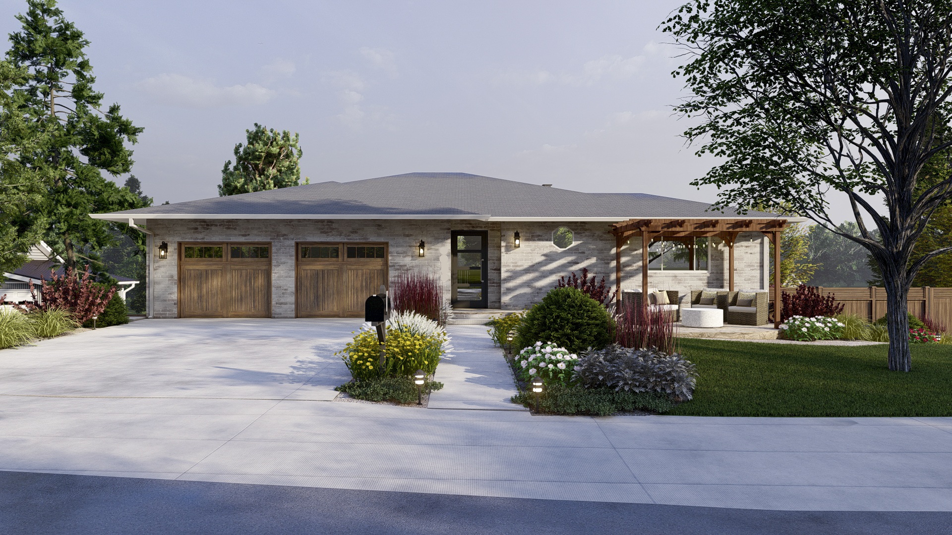 - Front Yard Curb Appeal: A welcoming entryway featuring a wood pergola over a cozy sitting area provides immediate charm. The front yard is framed by thoughtful, low-maintenance perennial plantings that add year-round color and texture.