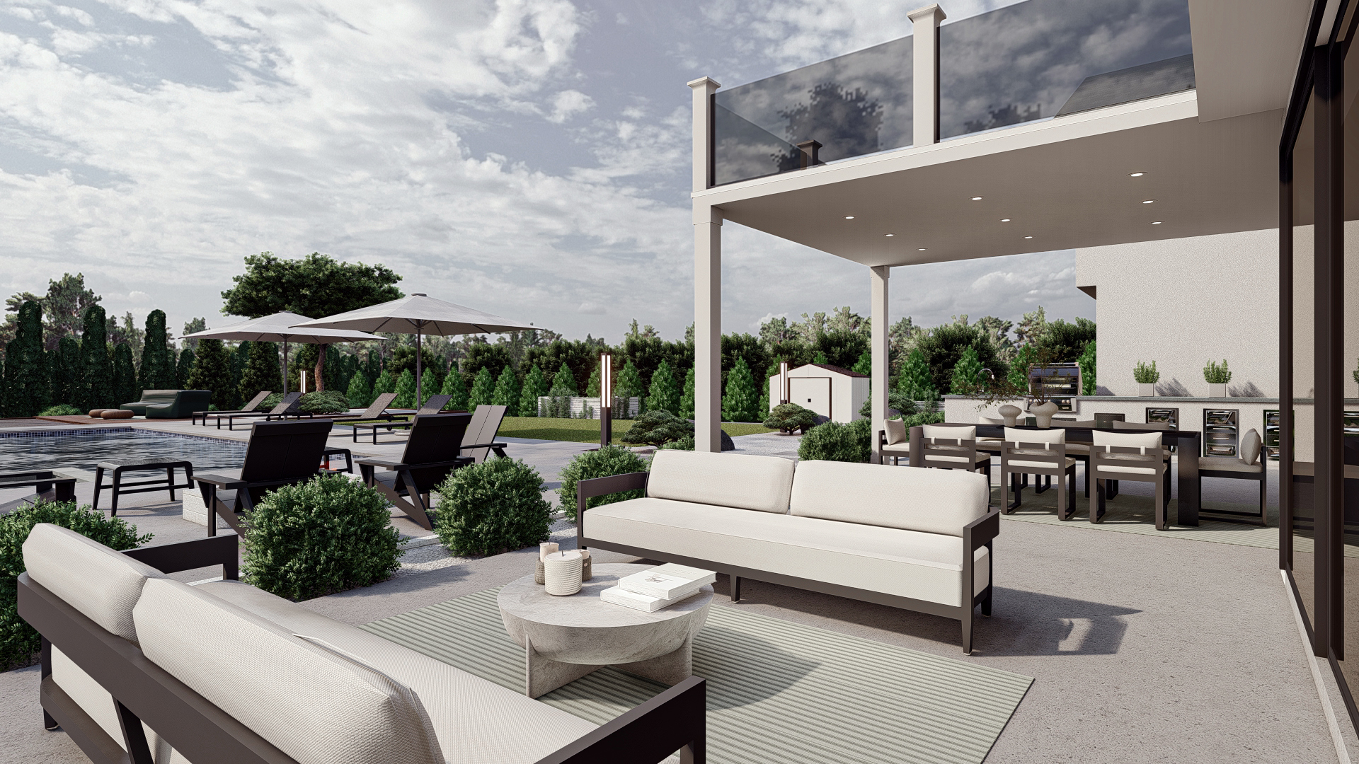 - Covered Outdoor Kitchen: The main patio features a modern, flat-roof black pergola covering a built-in outdoor kitchen and dining area. The rough, light stone material used for the kitchen structure introduces a rustic, organic texture that fits the arid environment.