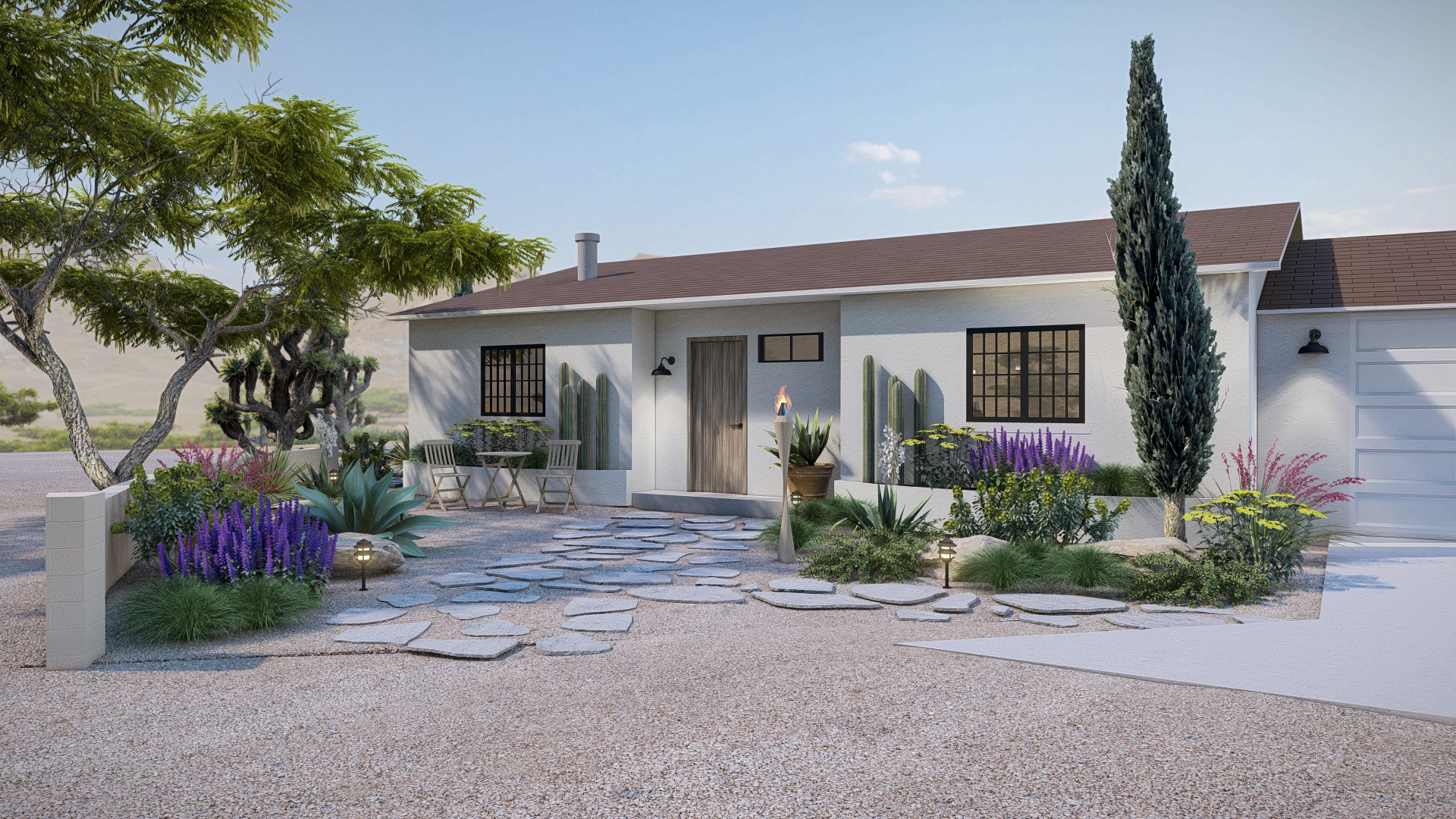 - Desert-Adaptive Front Yard: The entry utilizes the same palette of light gravel, flagstone, and low-water plantings to provide a welcoming yet highly sustainable curb appeal that is harmonious with the rugged California landscape.