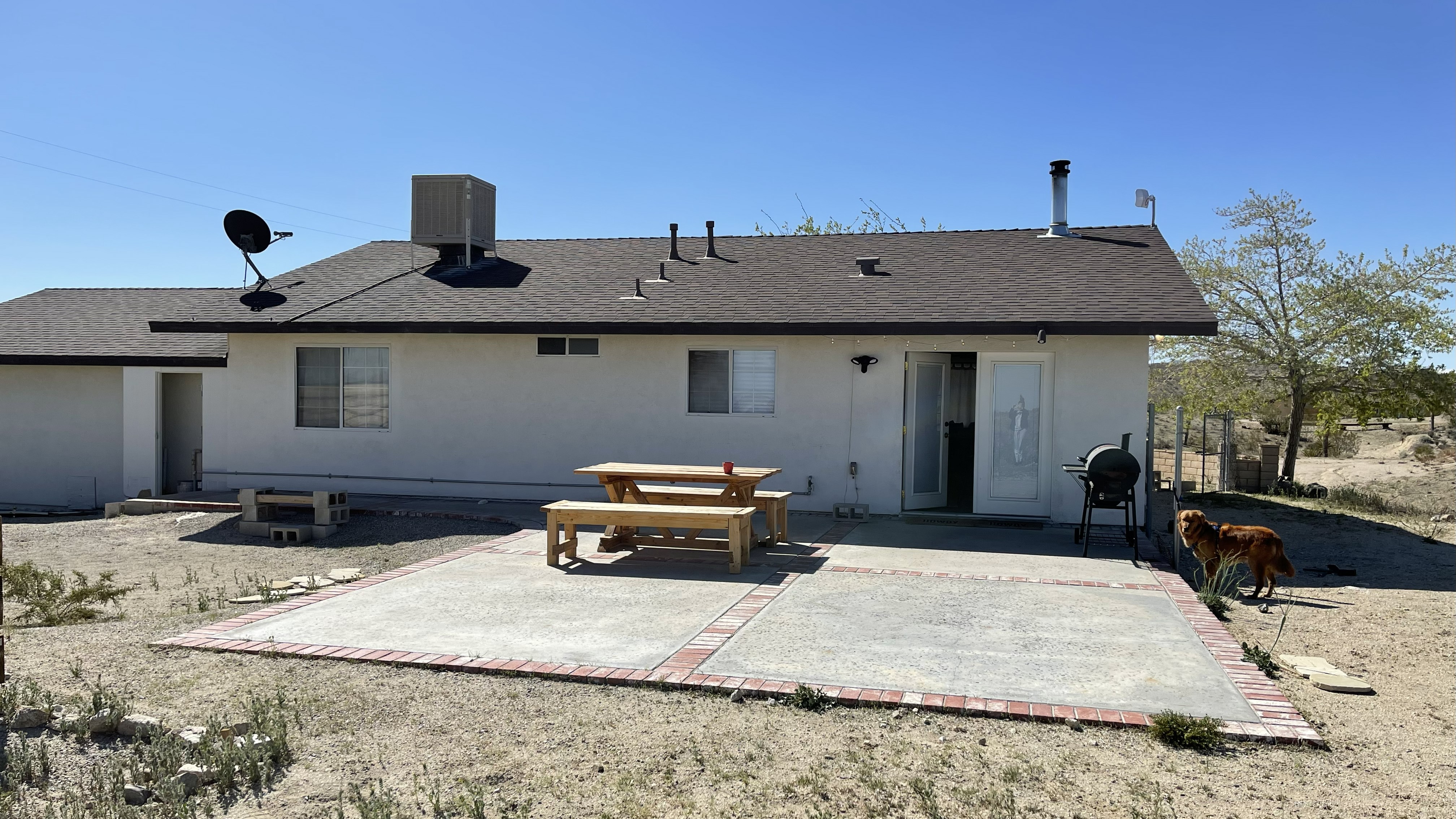 Full California desert yard transformation into a wellness retreat, featuring a covered outdoor kitchen, hot tub deck, barrel sauna, and natural, rustic landscaping with panoramic views.