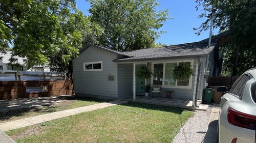- Front Yard Curb Appeal: The entry space utilizes a simple palette of clean lines, low-maintenance turf, and complementary gravel borders to frame the home's striking dark siding, offering a crisp, welcoming first impression.