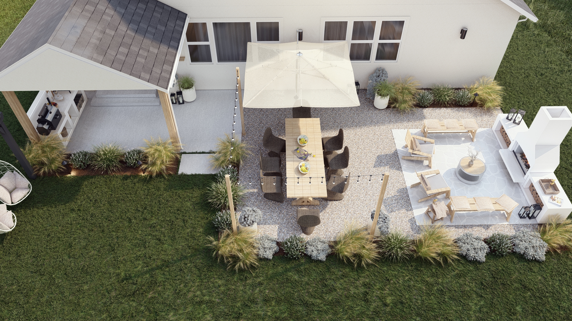 This project transforms a standard yard into a comprehensive outdoor living sanctuary that perfectly balances clean, modern design with cozy, rustic charm. Set against a beautiful mountain backdrop, the space is engineered for both intimate gatherings and large-scale entertaining, establishing a seamless and functional extension of the home. The design creates a series of connected "rooms" that offer distinct experiences—from dining under the stars to relaxing by a warm fire.