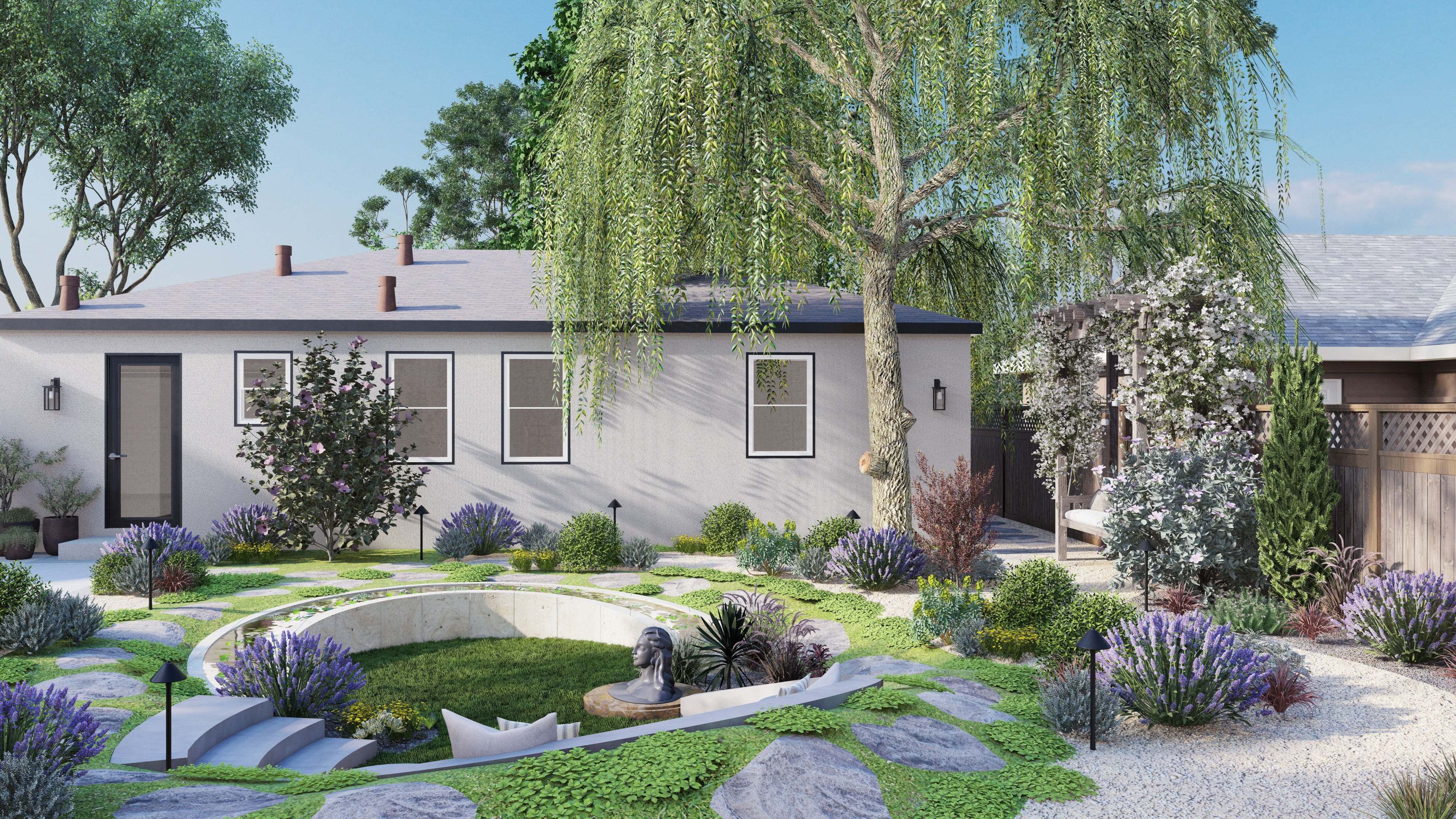 - Curvilinear Lounge & Water Feature: The centerpiece is a yin-yang inspired seating area with built-in concrete benches surrounding a sunken lawn, skirted by a peaceful water channel and decorative fountain.
