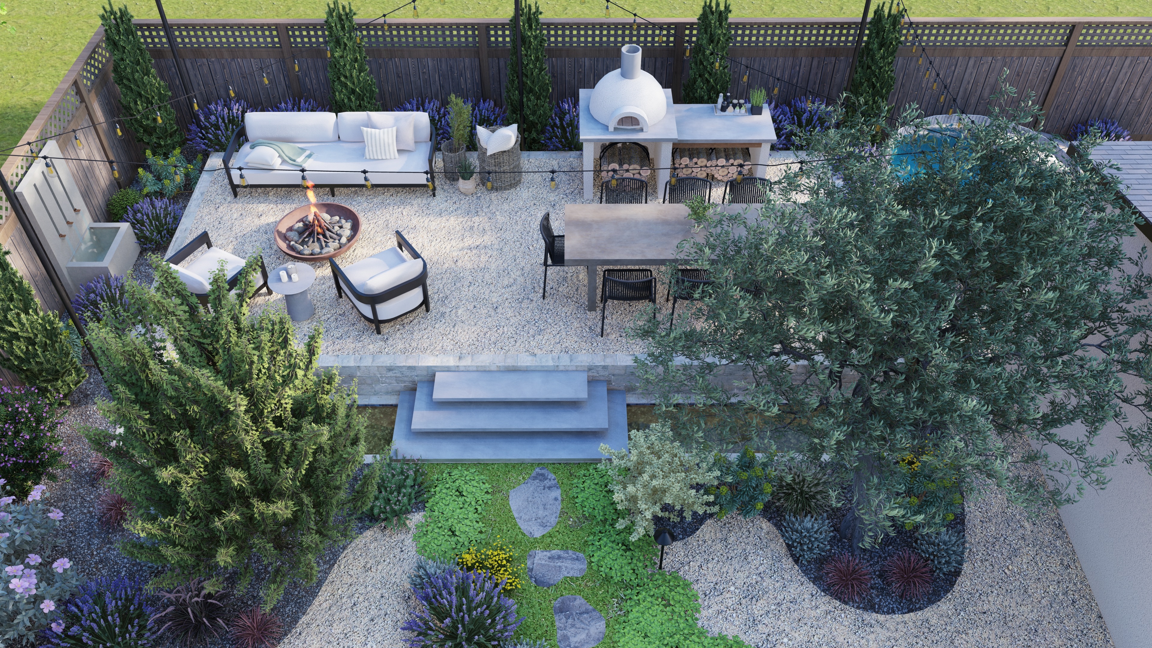 - Fire Pit Conversation Nook: A cozy gravel area is set around a contemporary fire pit, anchored by a comfortable outdoor sofa and armchairs for intimate gatherings.