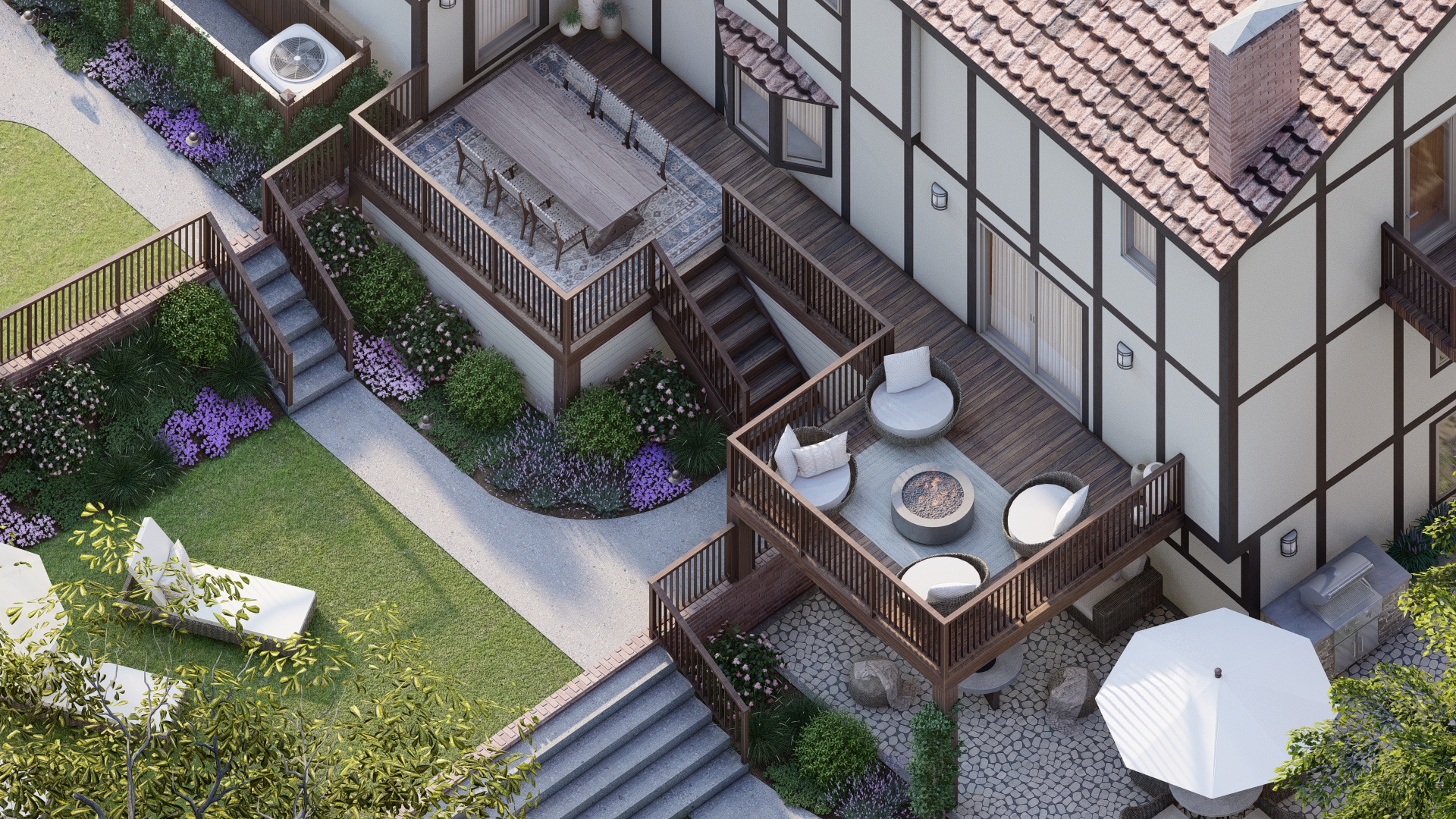 - Seamless Flow and Access: Wide, integrated wooden staircases and brick-lined steps ensure easy, natural movement between the different levels, connecting the upper decks to the ground-level lawn and patios.