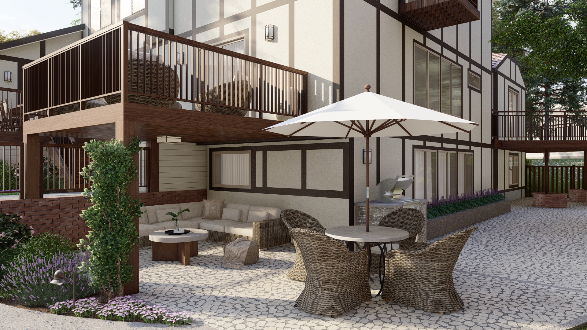 - Cobblestone Patio: The ground level is anchored by a charming, textural cobblestone patio, providing a durable, traditional surface for grilling, dining, and lower-level seating nestled beneath the upper deck.