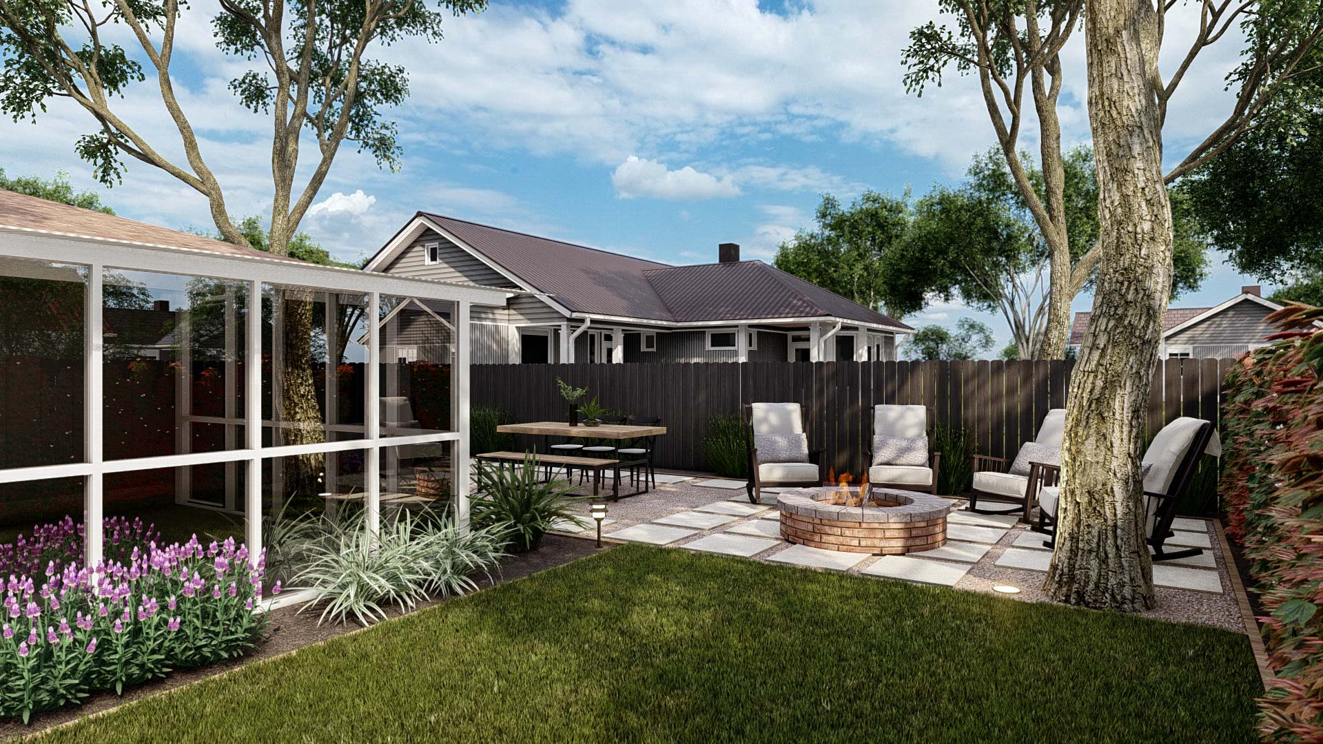 - Al Fresco Dining and Fire Pit: A designated patio area uses a visually appealing gravel and large paver grid for a modern, grounded feel. It serves as an elegant hub for outdoor gatherings, featuring a long dining table, stylish seating, and a classic brick-rimmed fire pit for cozy evenings.