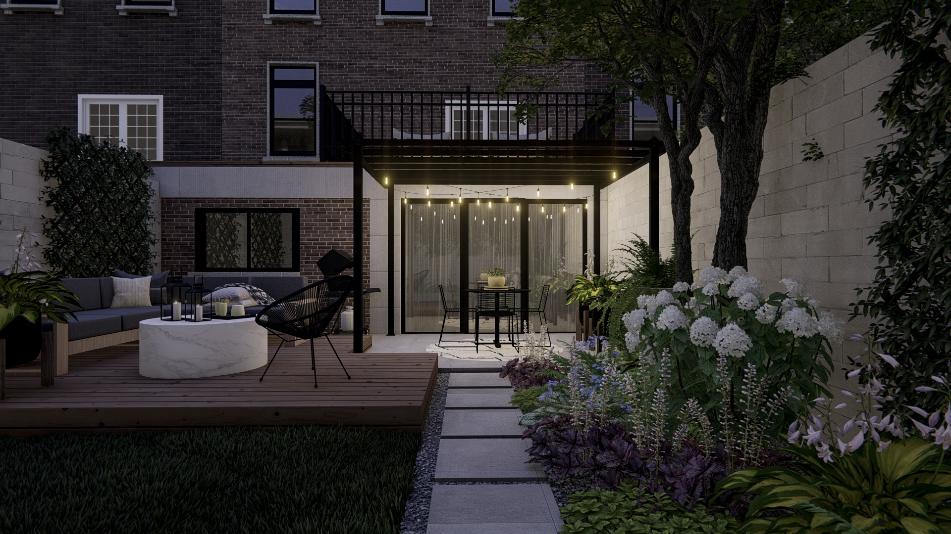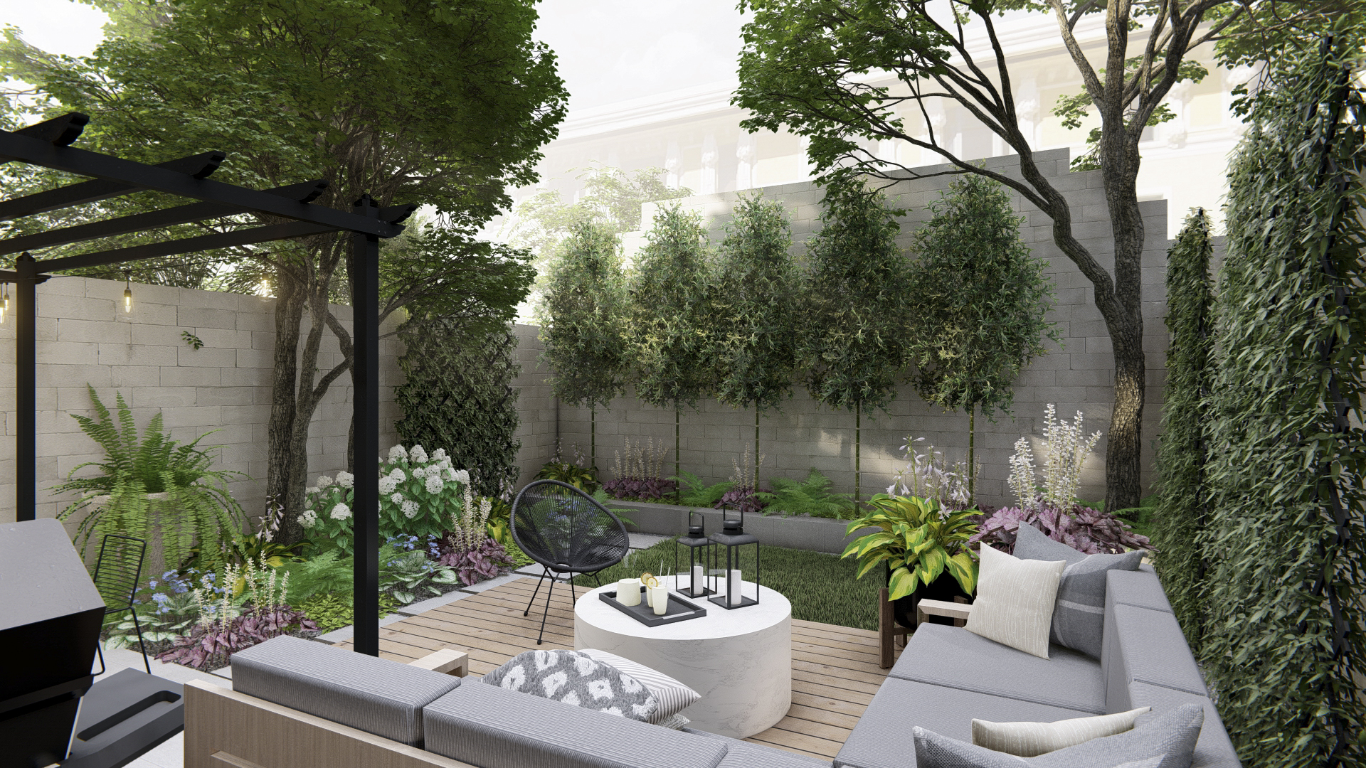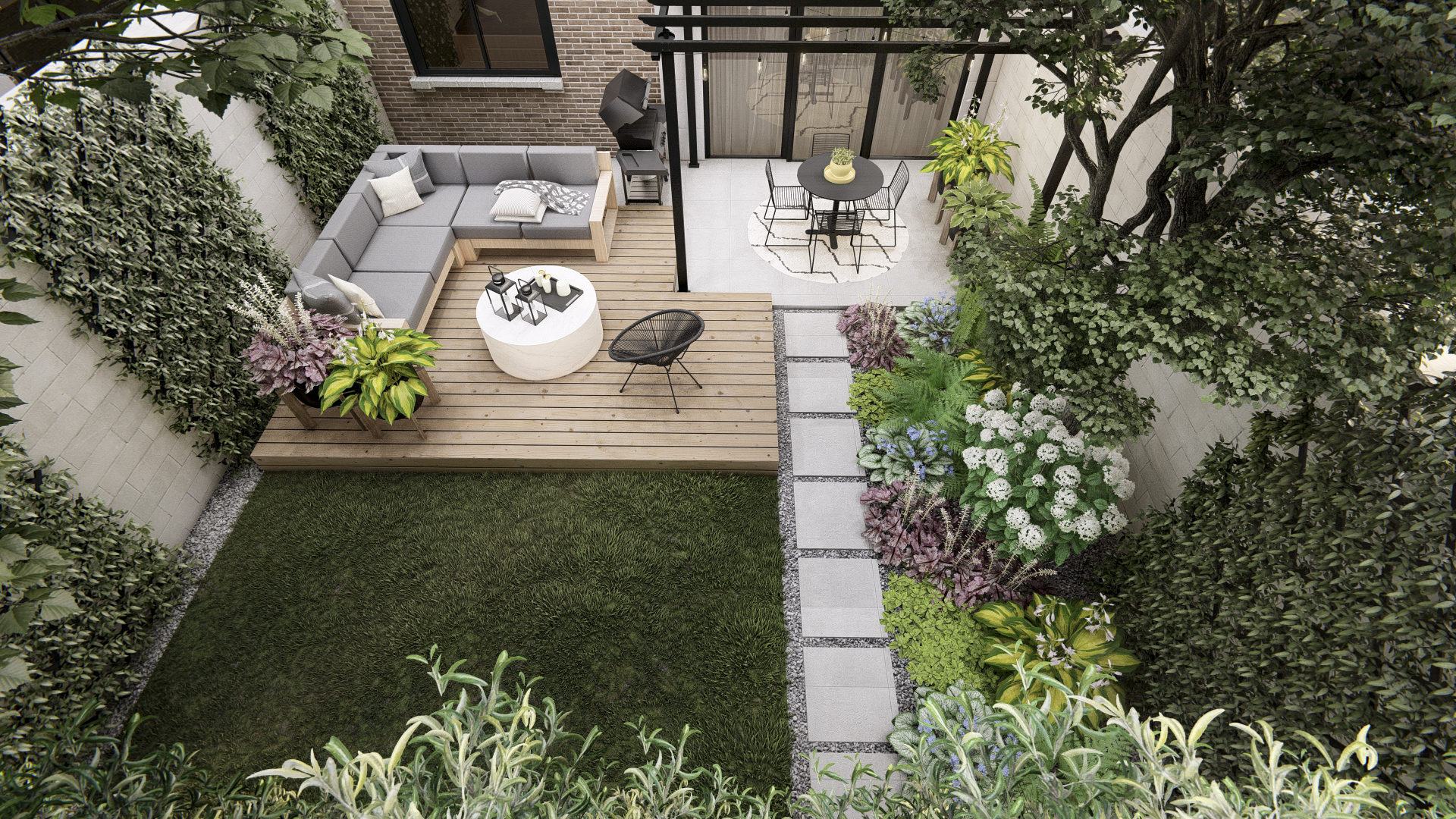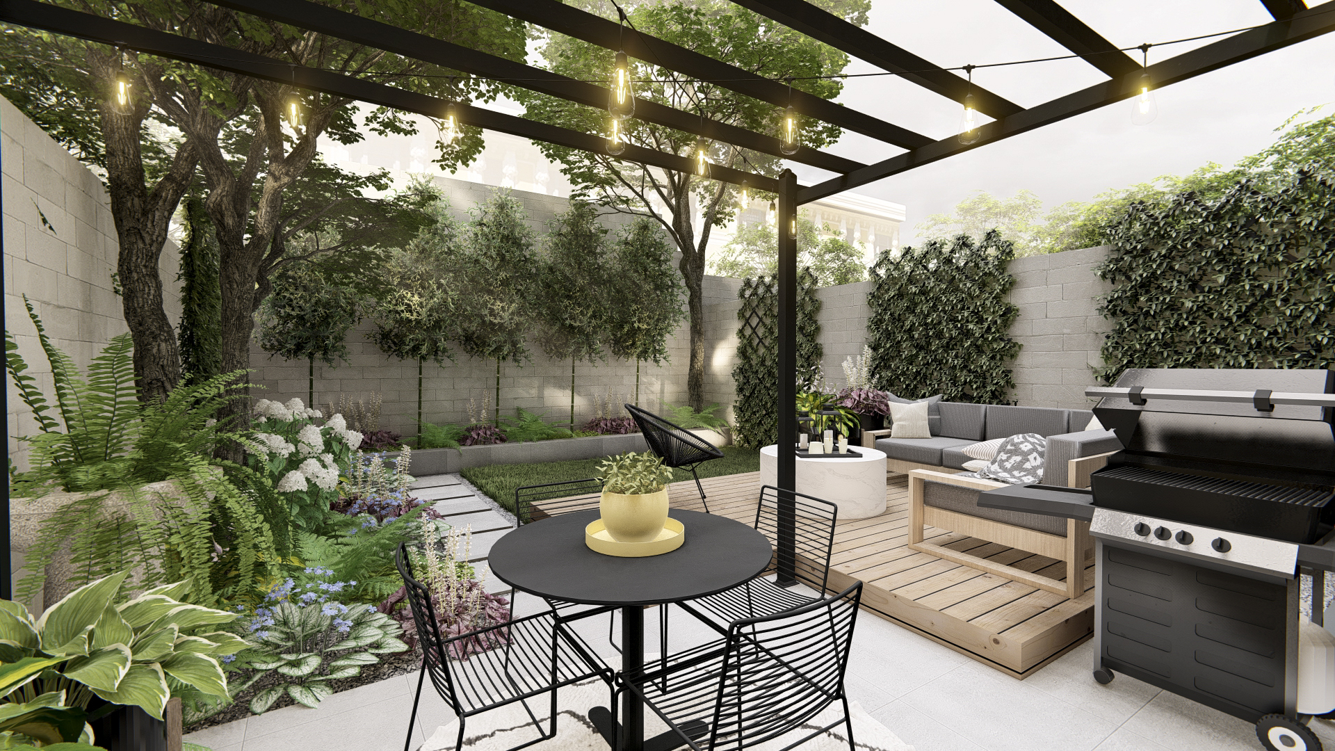 - Architectural Pergola: A tall, modern black pergola anchors the space, providing filtered shade and defining the dining area. It adds significant vertical interest, enhancing the feeling of a distinct outdoor room.
