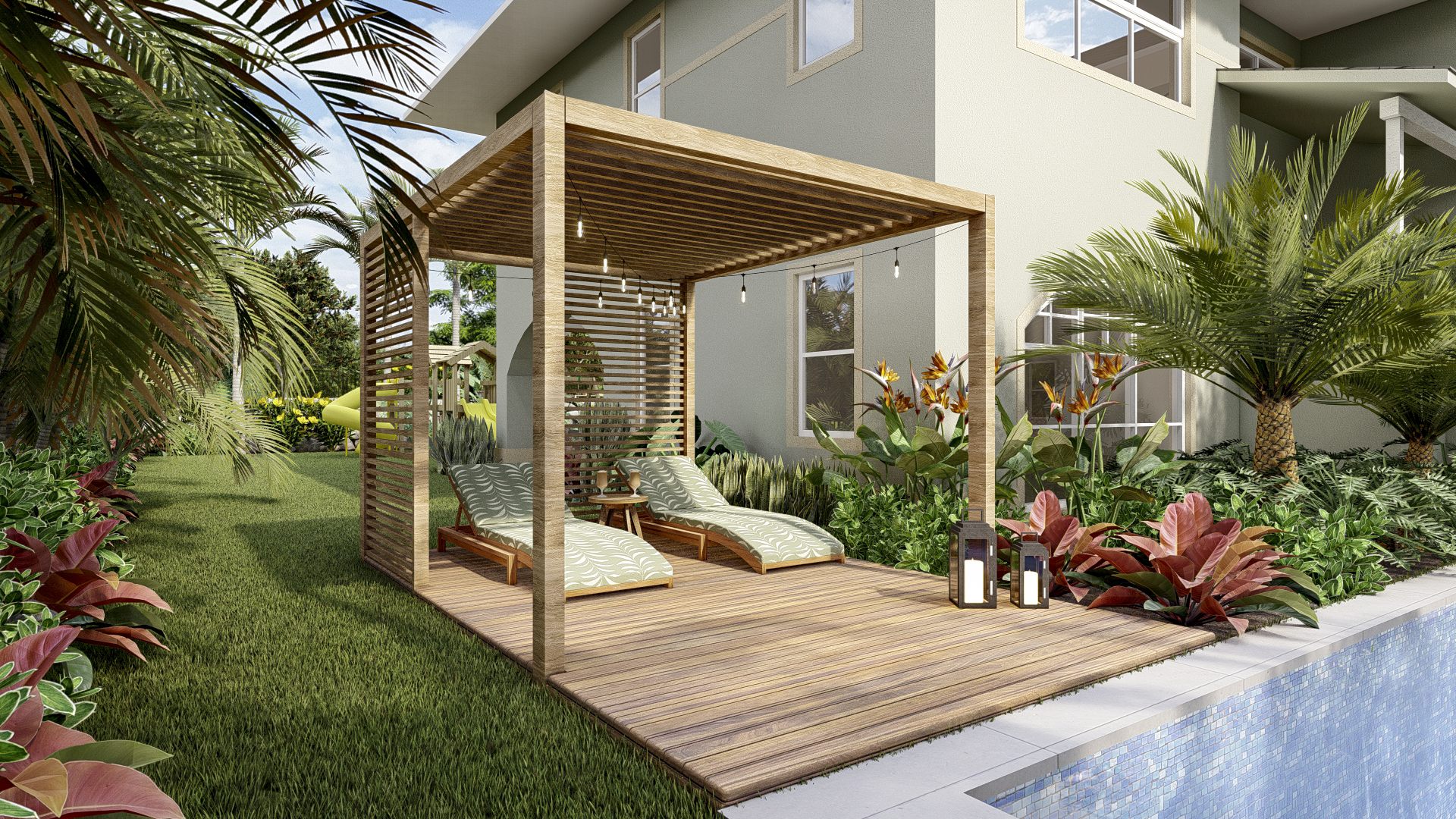 - Tropical Pergola Lounge: A wooden pergola offers a secluded, shaded retreat adjacent to the pool. This space is designed for intimate relaxation and is surrounded by dense, exotic plants.